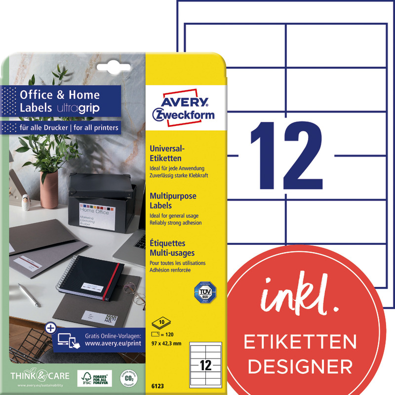 Die weißen, permanent haftenden Universal-Etiketten 6123 im Format 97x42,3mm von AVERY ZWECKFORM eignen sich z.B. als Namensetikett oder für die Dt. Post Internetmarke (120 Etiketten auf 10 Bogen /Pckg). Dank der innovativen ultragrip-Technologie können Sie sich auf einen ultrapräzisen Druckereinzug und absolut staufreien Druckerdurchlauf verlassen.