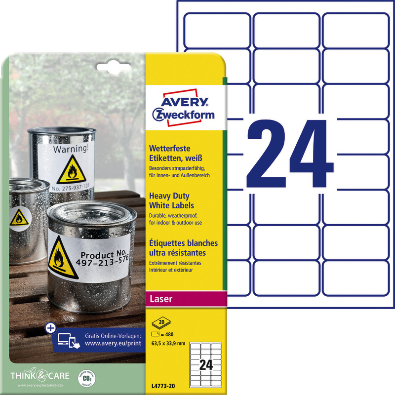 AVERY® Zweckform Wetterfeste Folien-Etiketten L4773-20, weiß, B x H: 63, 5 x 33, 9 mm, Pack: 480 Stück