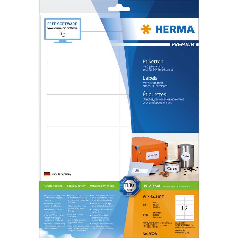 Produktinformationen "HERMA PREMIUM Etiketten 8628, B x H: 97 x 42, 3 mm, weiß"