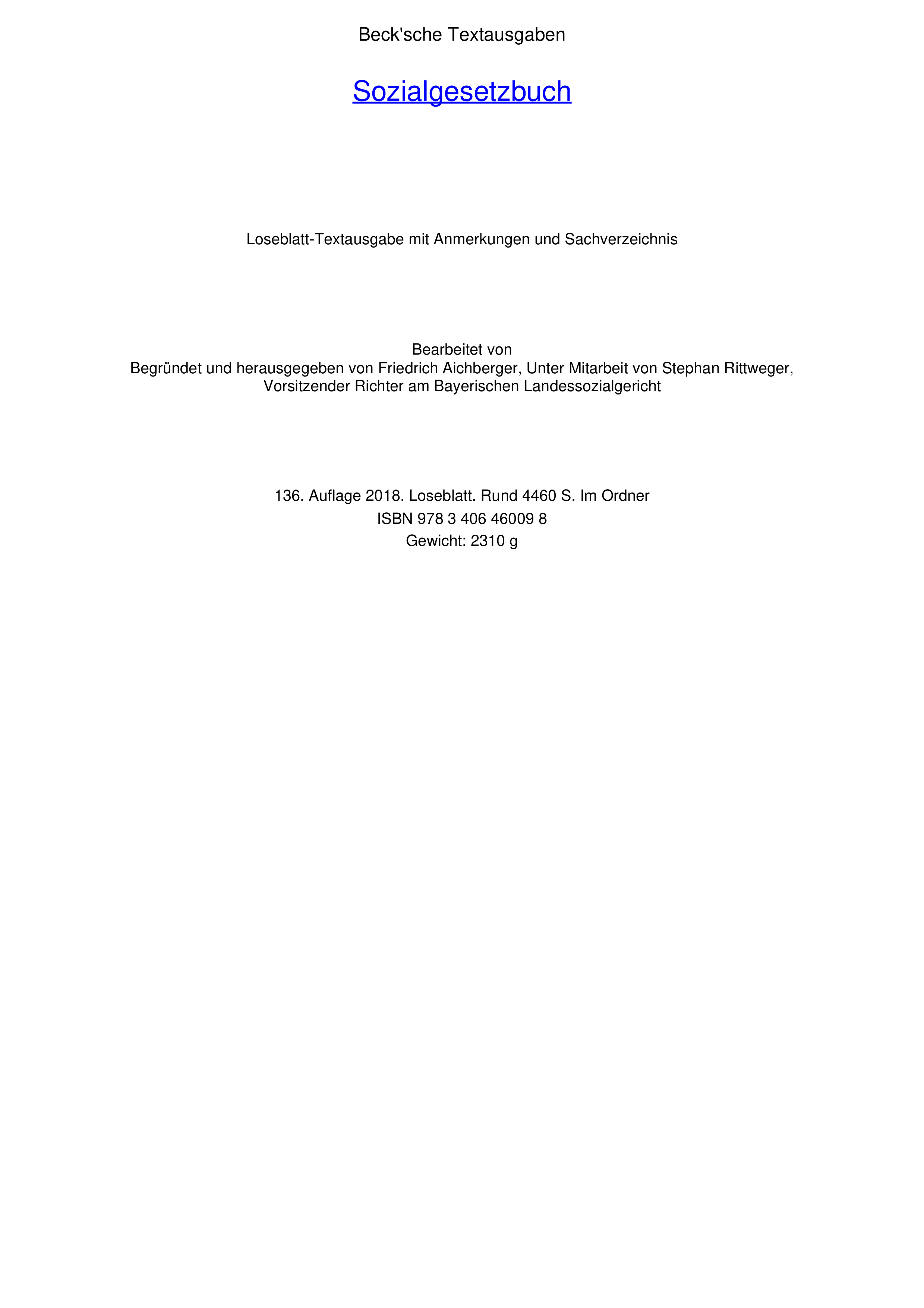 Der Aichberger bietet eine umfassende Sammlung aller wichtigen Gesetze und anderer Rechtsnormen zu sämtlichen Zweigen des Sozialversicherungsrechts und der übrigen Bereiche des Sozialrechts. Er ist nach den einzelnen Büchern des SGB gegliedert, denen jeweils wichtige Nebenbestimmungen zugeordnet sind.