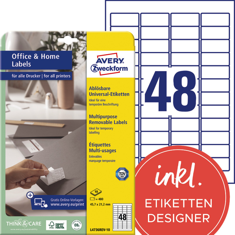 AVERY® Zweckform Universal-Etiketten L4736REV-10, wiederablösbar, weiß, B x H: 45, 7 x 21, 2 mm, Pack: 480 Stück