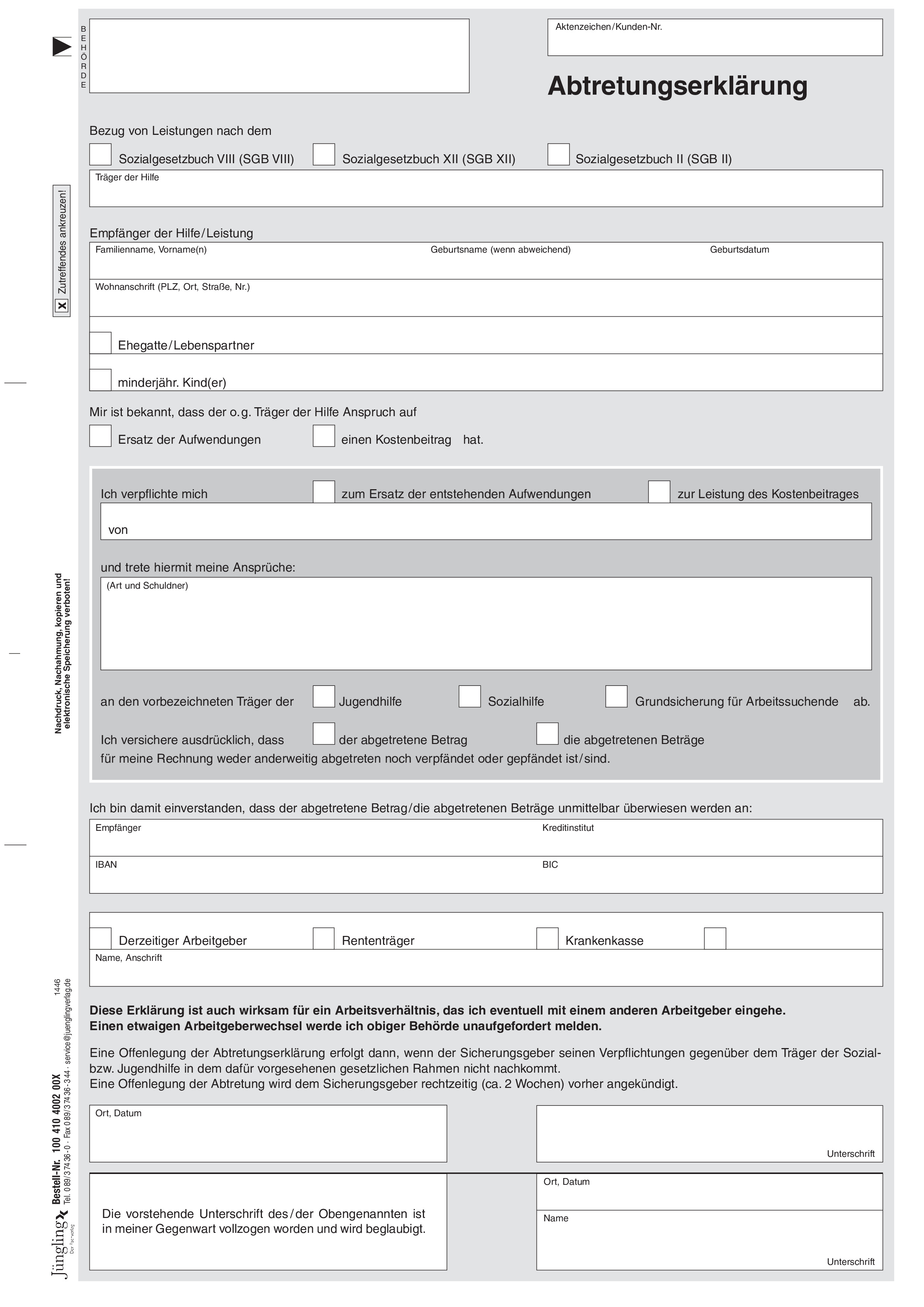 Die Abtretungserklärung im DIN A4-Format ist mehrfach selbstdurchschreibend und eignet sich ideal für Behörden und Unternehmen. Sie wird in praktischen Blöcken zu jeweils 100 Blatt geliefert.