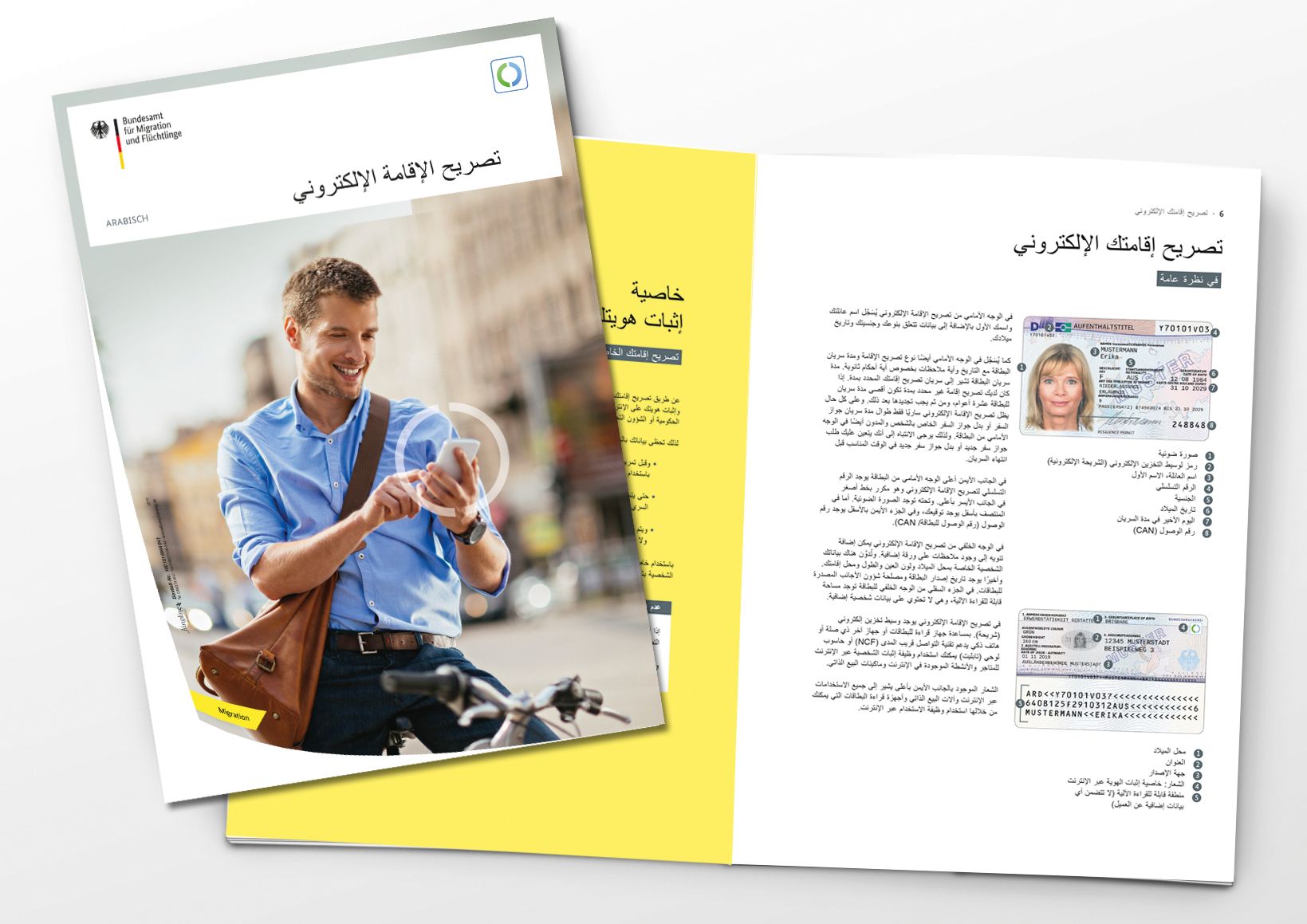 Die amtliche Informationsbroschüre Der elektronische Aufenthaltstitel bietet detaillierte Informationen nach § 78 Abs. 5 AufenthG im Format DIN A4 (210 x 297 mm). Sie ist speziell für arabischsprachige Bürger konzipiert und vermittelt wichtige Informationen rund um den elektronischen Aufenthaltstitel.