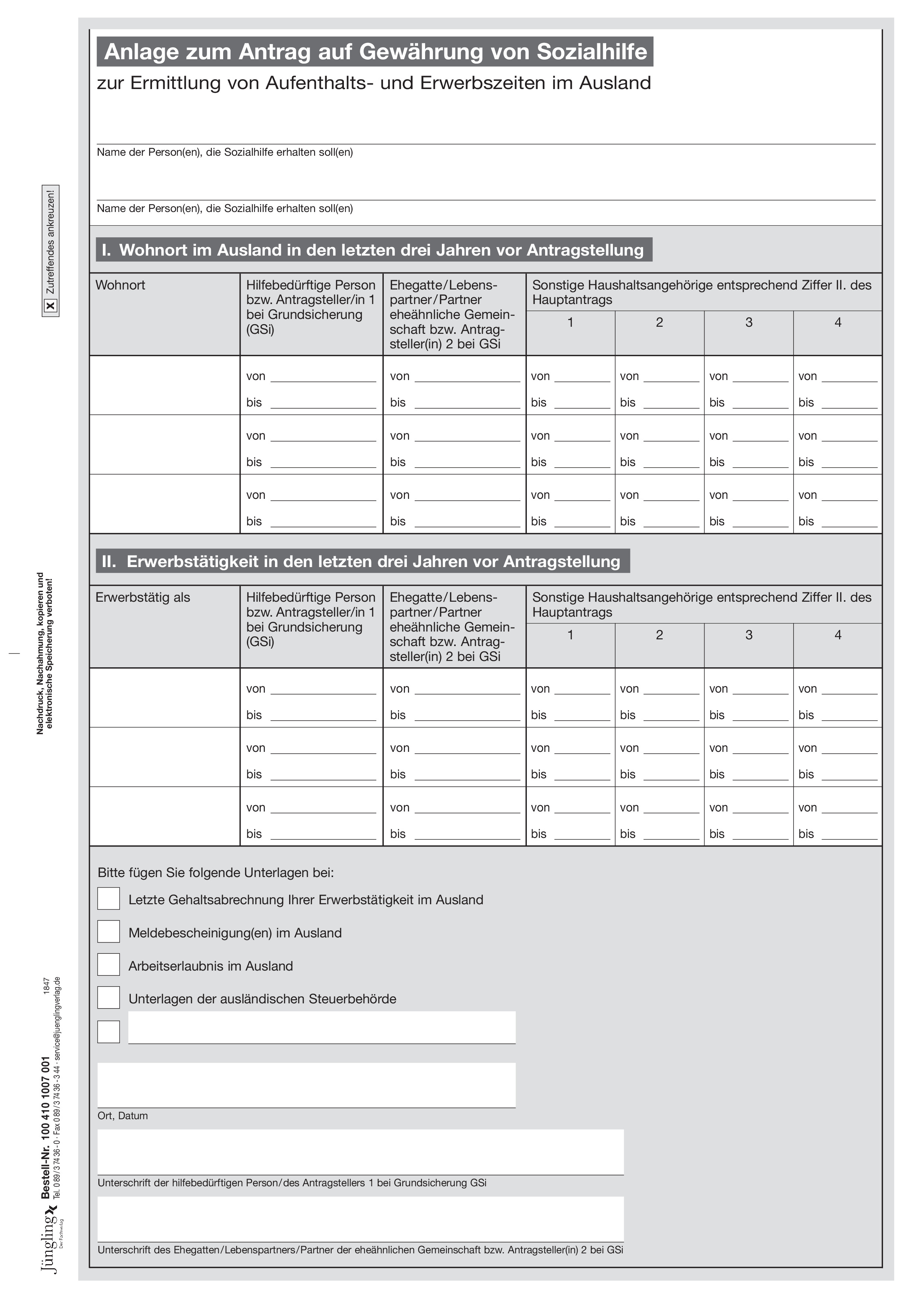 Produktinformationen "Anlage zur Ermittlung von Aufenthalts- und Erwerbszeiten im Ausland für Sozialhilfeanträge, A4"