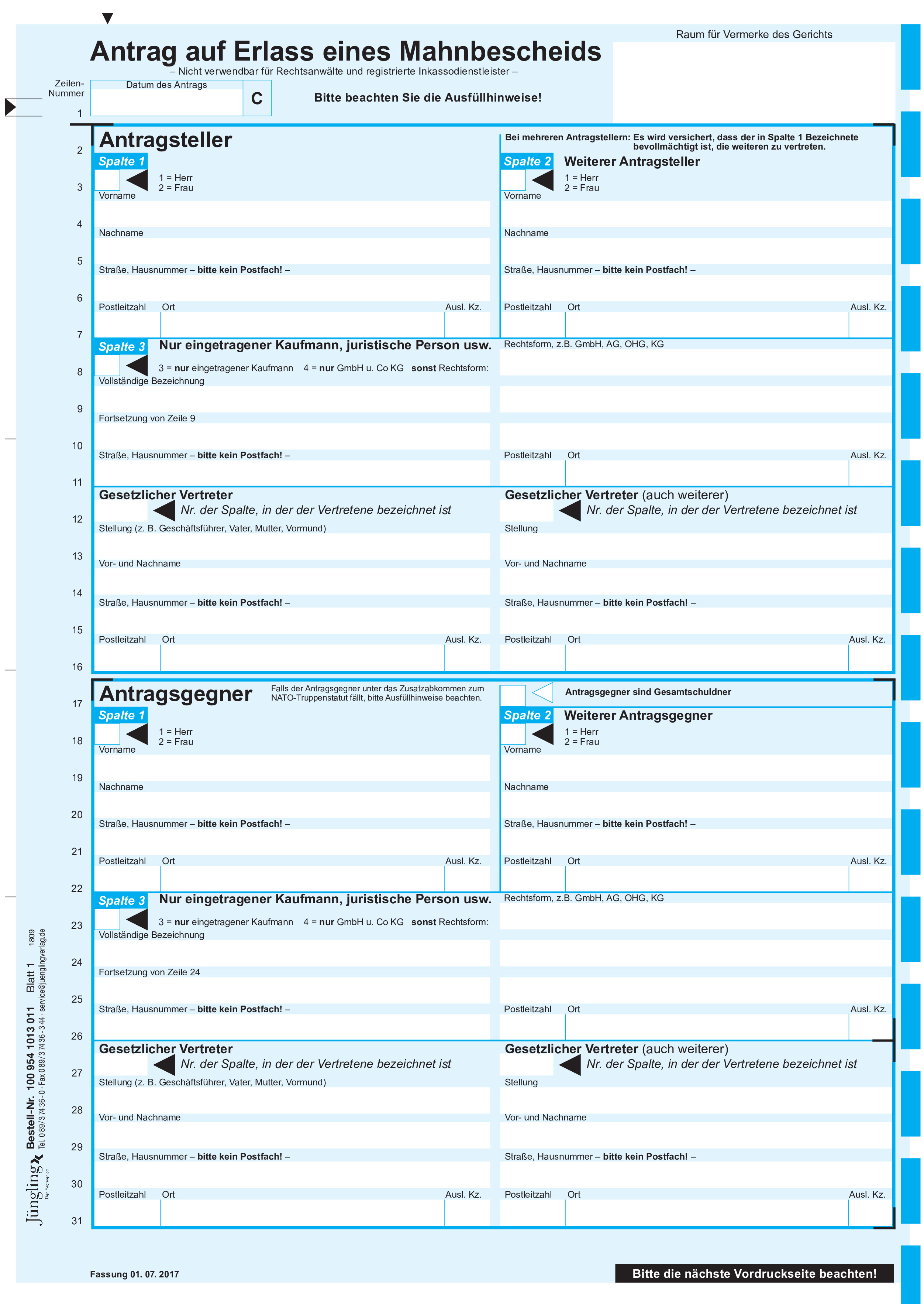Antrag auf Erlass eines Mahnbescheids, Formular für Laserdrucker, A4