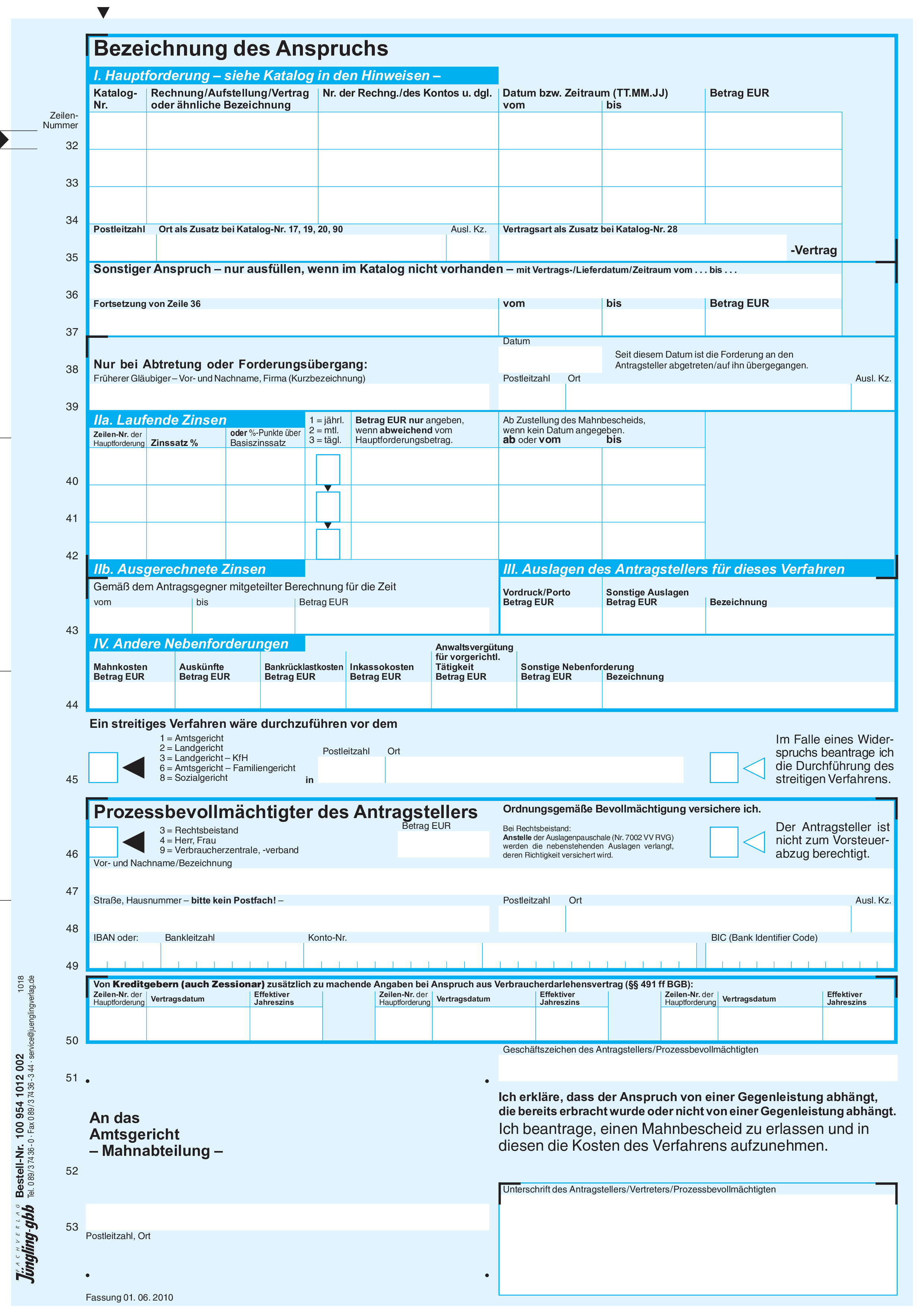 Antrag auf Erlass eines Mahnbescheids bundesweit (blanko), A4 2-fach