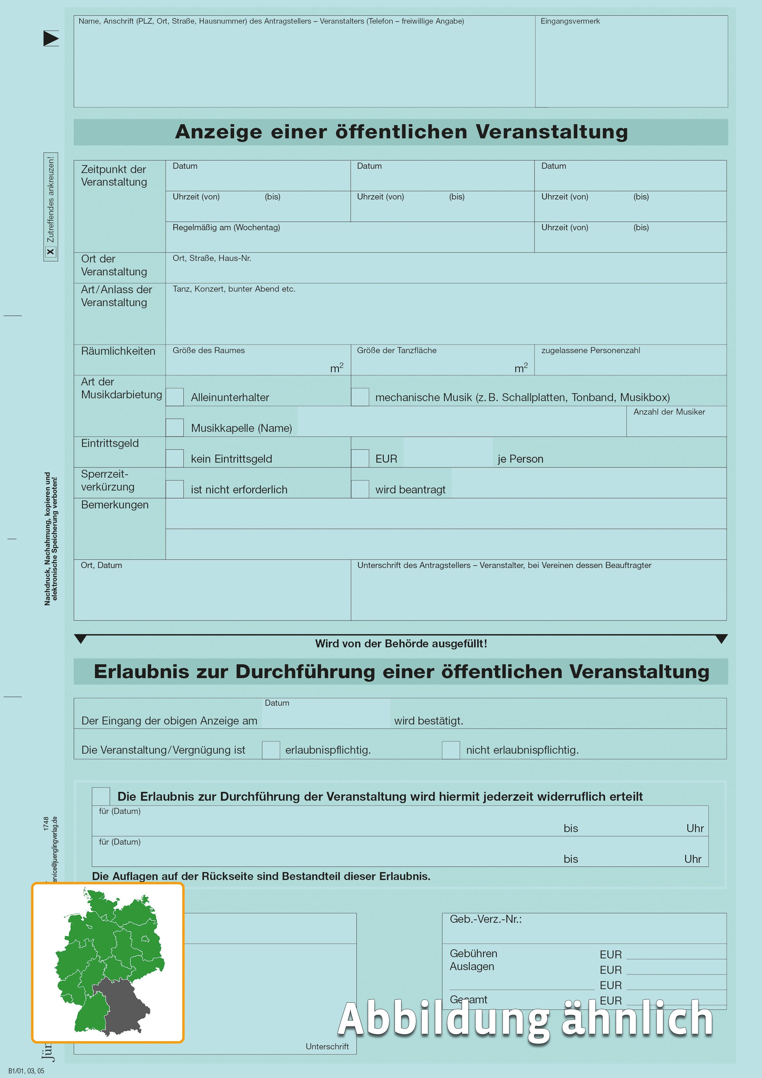 Dieses Produkt richtet sich besonders an Behörden und Veranstaltungsplaner, die öffentliche Veranstaltungen verwalten und dokumentieren müssen. Mit der klaren Farbgestaltung und der vierfachen Ausführung können verschiedene Kopien einfach archiviert oder weitergeleitet werden.
