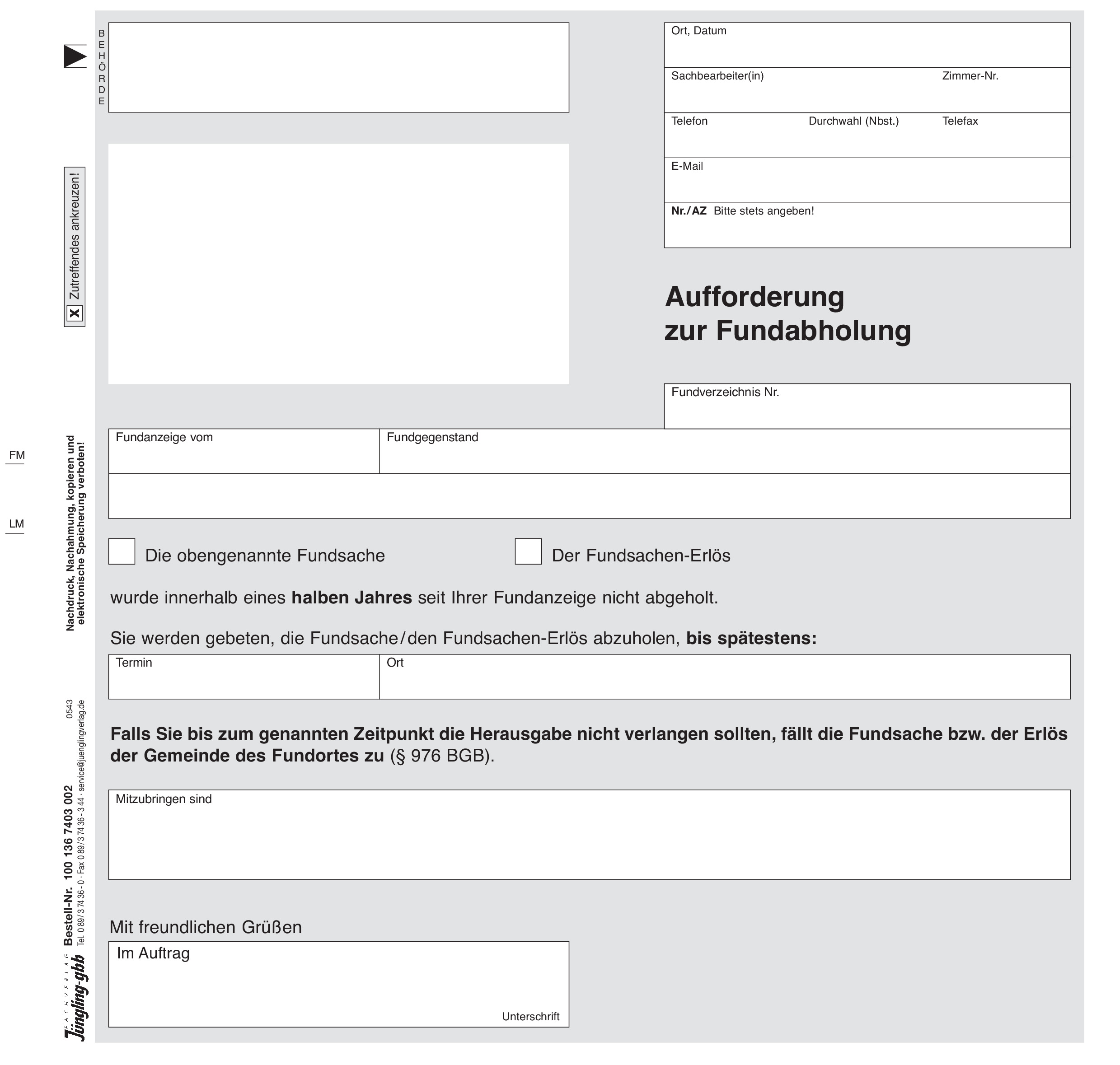 Die Aufforderung zur Fundabholung ist ein speziell entwickeltes Formular, das es Behörden und Unternehmen erleichtert, Finder zur Abholung gefundener Gegenstände zu benachrichtigen. Das Formular ist 210 x 200 mm groß, 1-seitig bedruckt und besteht aus zwei selbstdurchschreibenden Blättern in den Farben Weiß und Rosa.