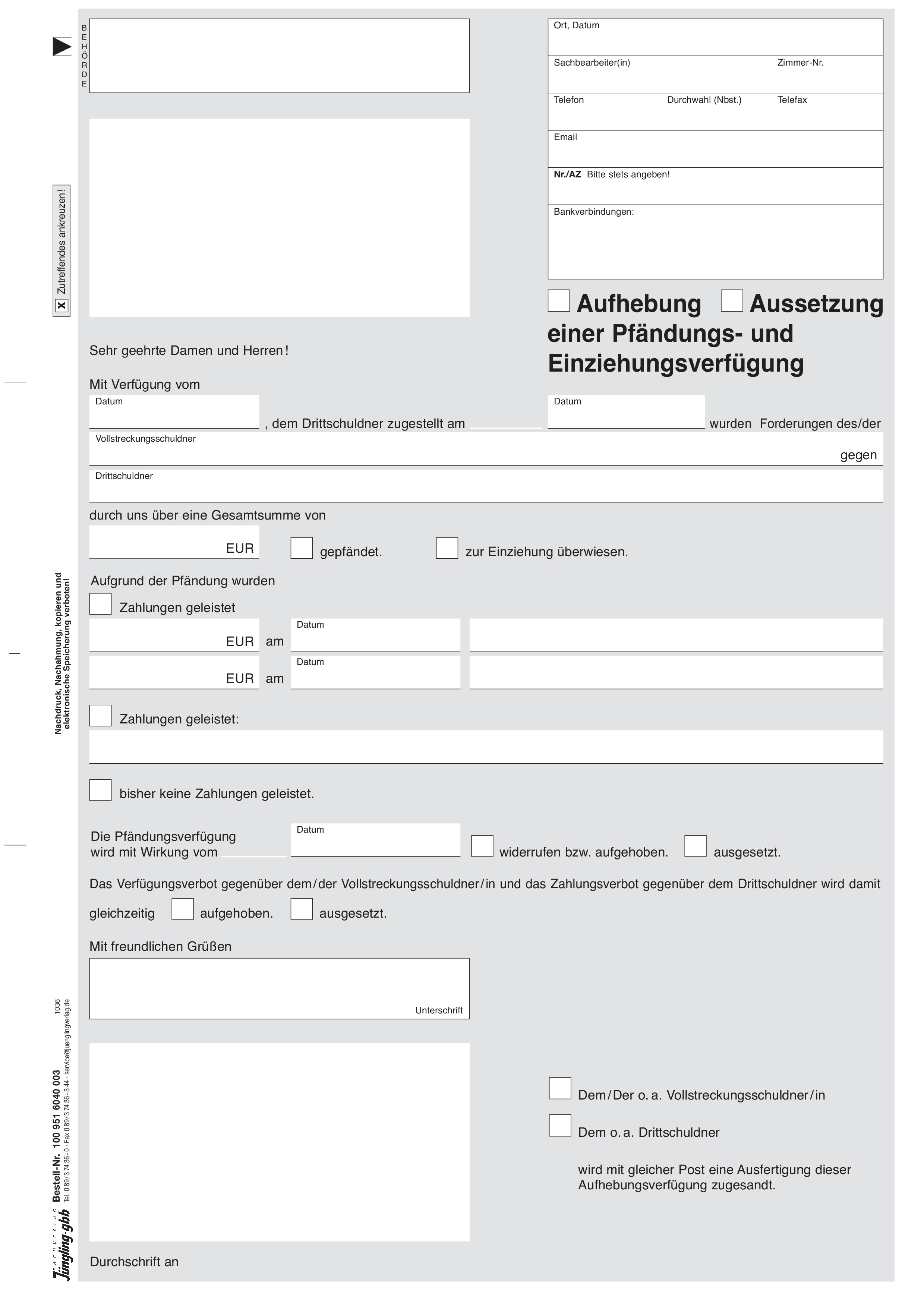 Produktinformationen "Aufhebung einer Pfändungs-/Überweisungsverfügung, 3-fach"