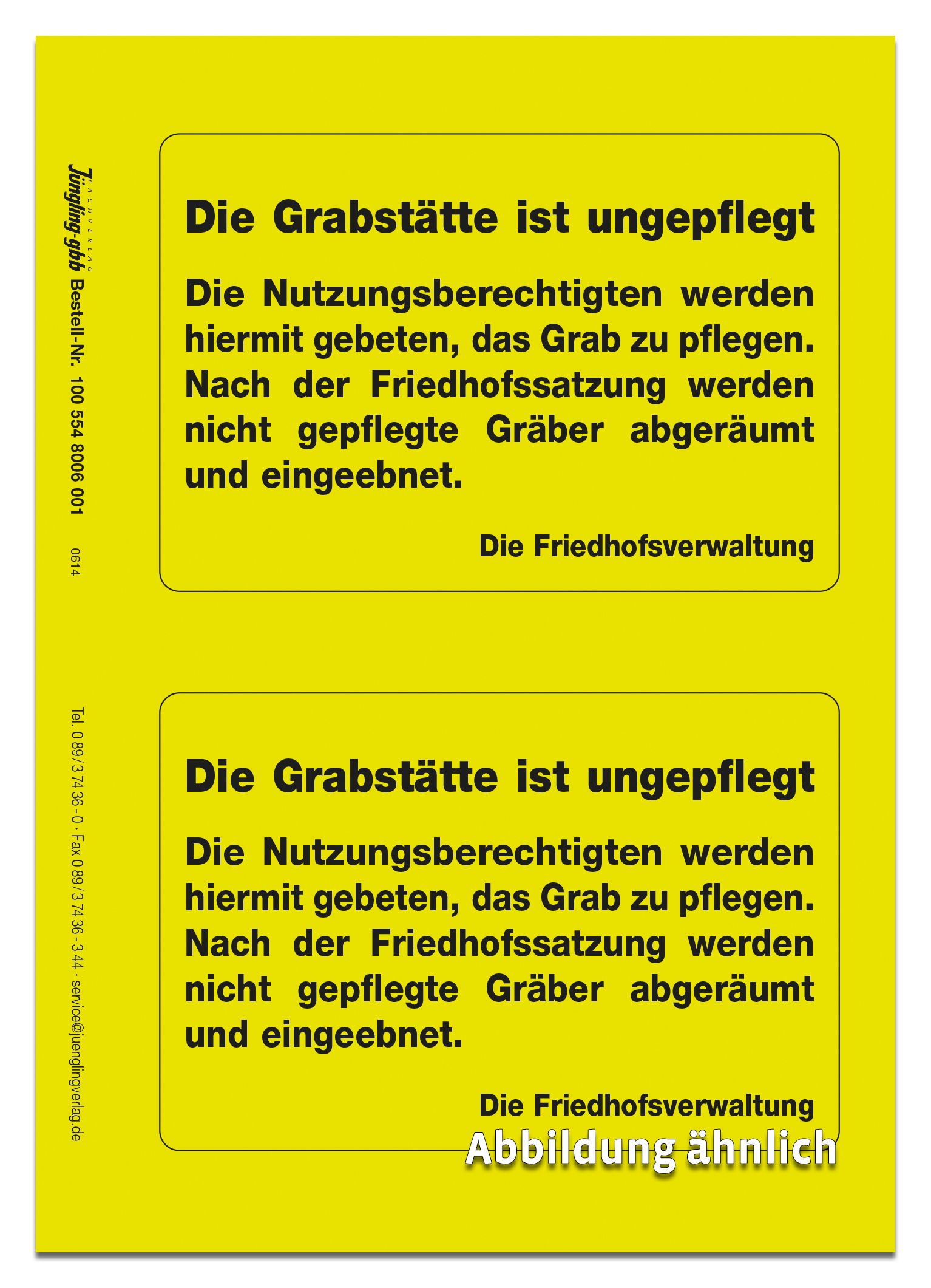 Diese gelben Aufkleber im Format 105 x 74 mm sind speziell zur Kennzeichnung ungepflegter Grabstätten entwickelt. Die Aufkleber bestehen aus Haftpapier, was eine einfache Anbringung ermöglicht. Ein Bogen enthält zwei Aufkleber. Lieferung auf 1 Blatt, 1-seitig bedruckt in Schwarz.