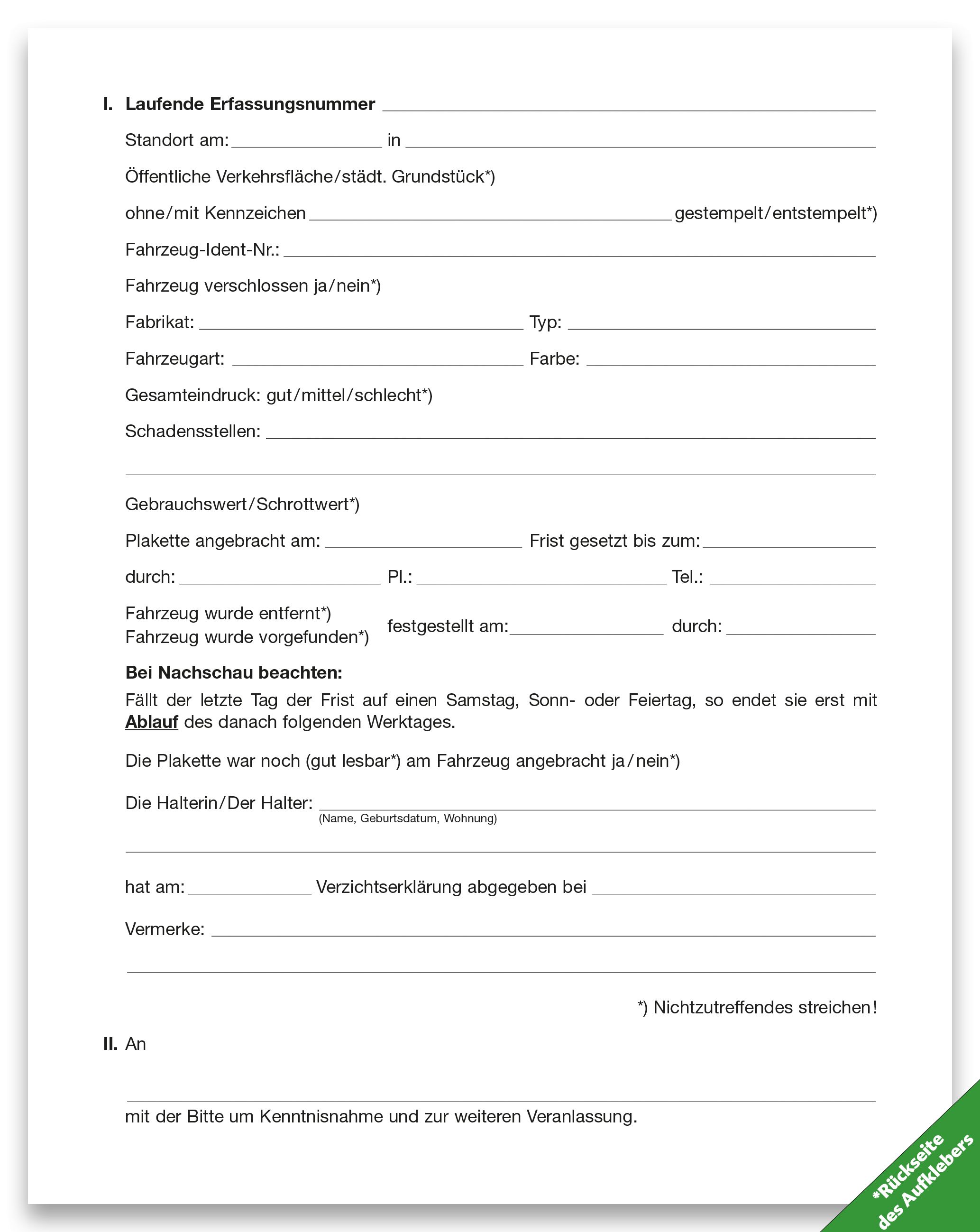 Unsere leuchtroten Aufkleber in A5-Format sind speziell entwickelt für die Kennzeichnung von Kraftfahrzeugen, Anhängern und Gegenständen, die gemäß dem Straßengesetz des Landes Sachsen-Anhalt und der Straßenverkehrsordnung (StVO) als verkehrswidrig abgestellte Hindernisse gelten. Die 2-seitigen Aufkleber sind in kräftigem Rot gehalten und bieten die Möglichkeit eines individuellen Behördeneindrucks.