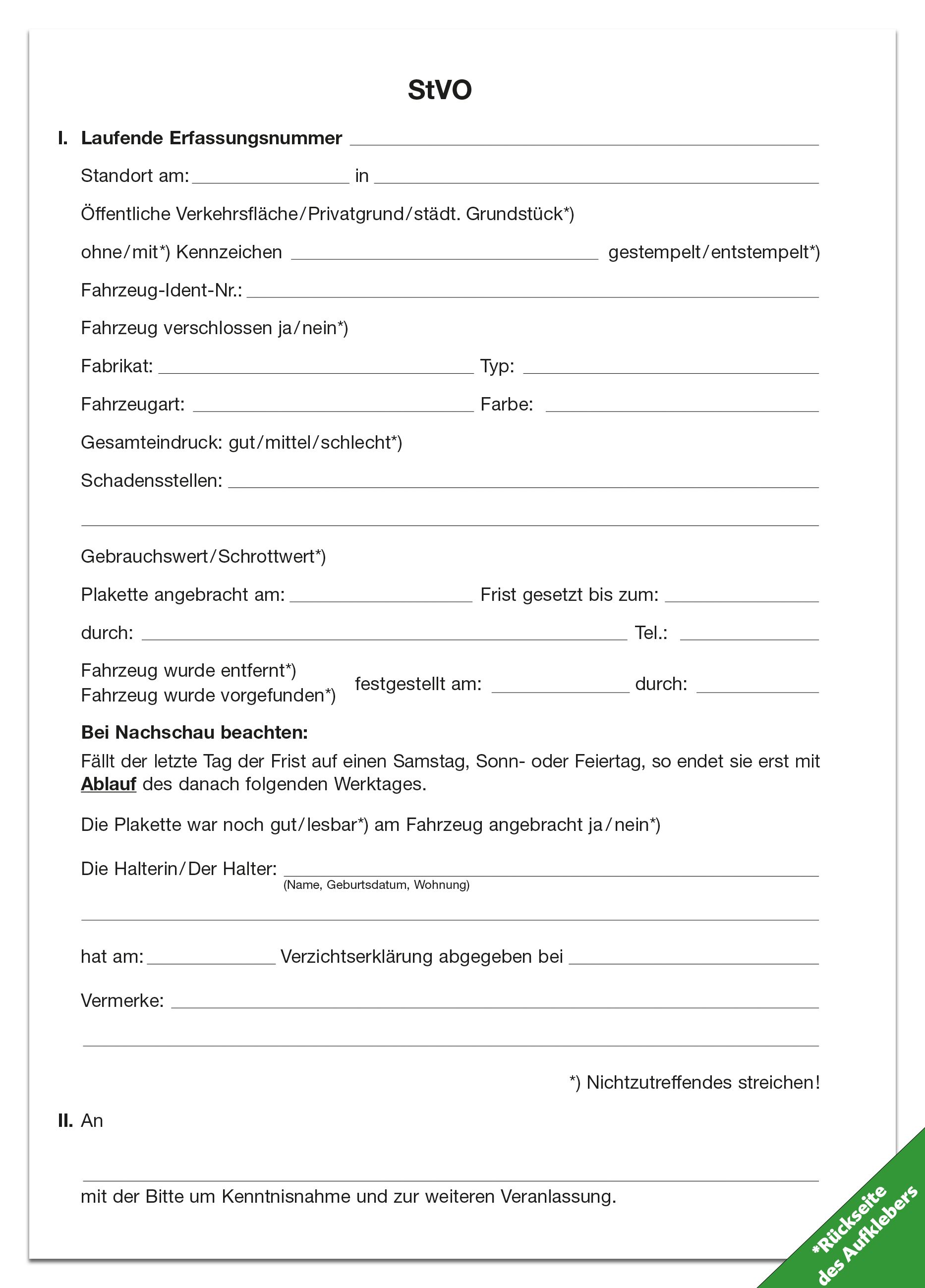 Hinweis-Aufkleber nach StVO auf das verbotswidrige Abstellen eines Fahrzeugs. (Verkehrshindernis gemäß Straßenverkehrsordnung) Format: 148 x 210 1 Blatt, 2seitig, leuchtrot 1/1farbig Rückseite geschlitzt senkrecht 10 mm von rechts, so lässt sich der Aufkleber leicht vom Trägermaterial abziehen Individueller Behördeneindruck möglich Die 2. Seite wird auf die Rückseite des Trägerpapiers gedruckt.