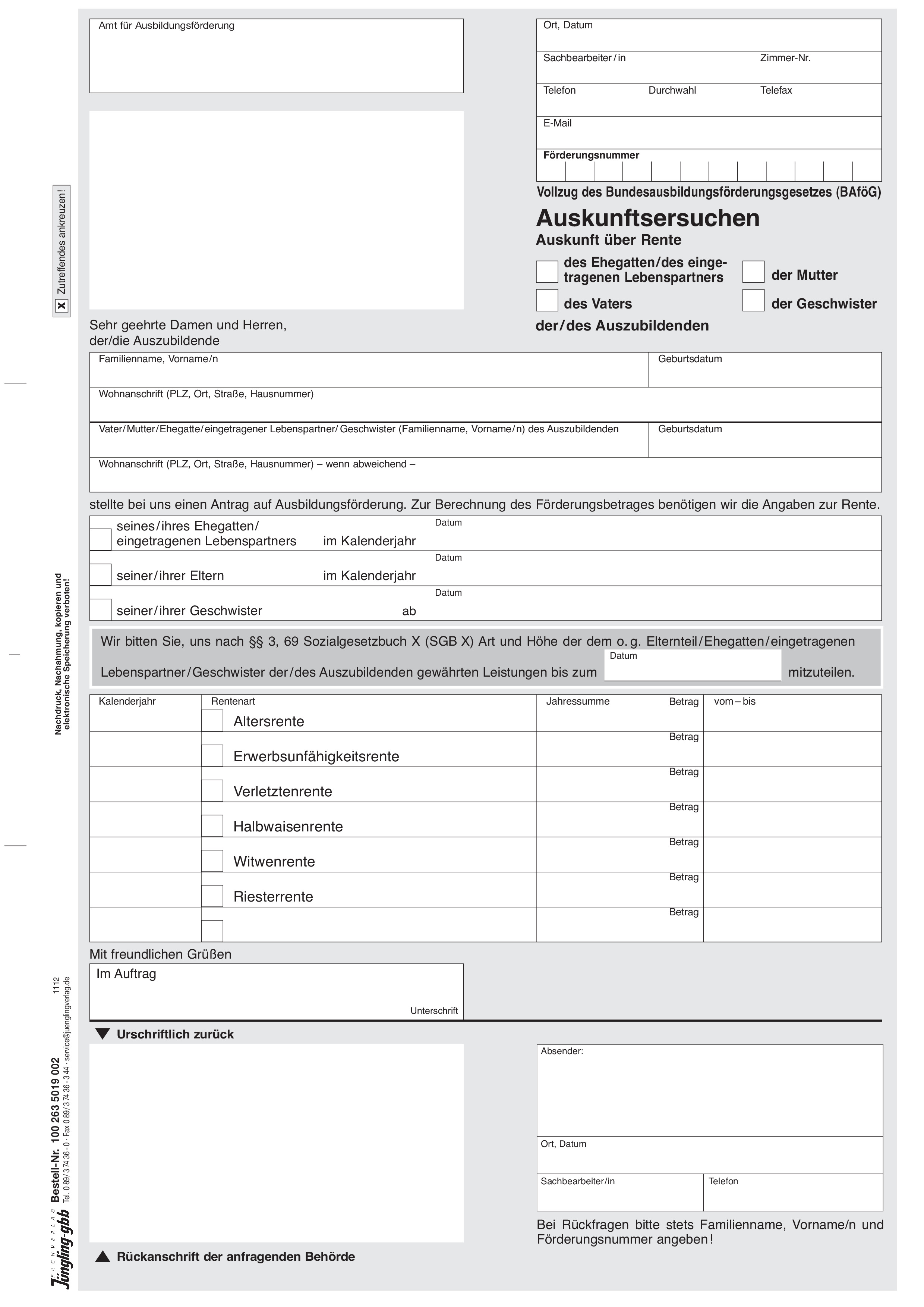 Die Auskunft über den Bezug von Rente des Ehegatten, der Mutter, des Vaters oder der Geschwister ist ein praktisches und übersichtliches Formular. Das Formular ist im Format 210 x 297 mm (DIN A4) und wird 1-seitig gedruckt. Es besteht aus zwei Durchschlägen (SD-Formular), die Originalseite ist weiß und die Kopie in rosa. Hier sind die Vorteile aufgelistet: