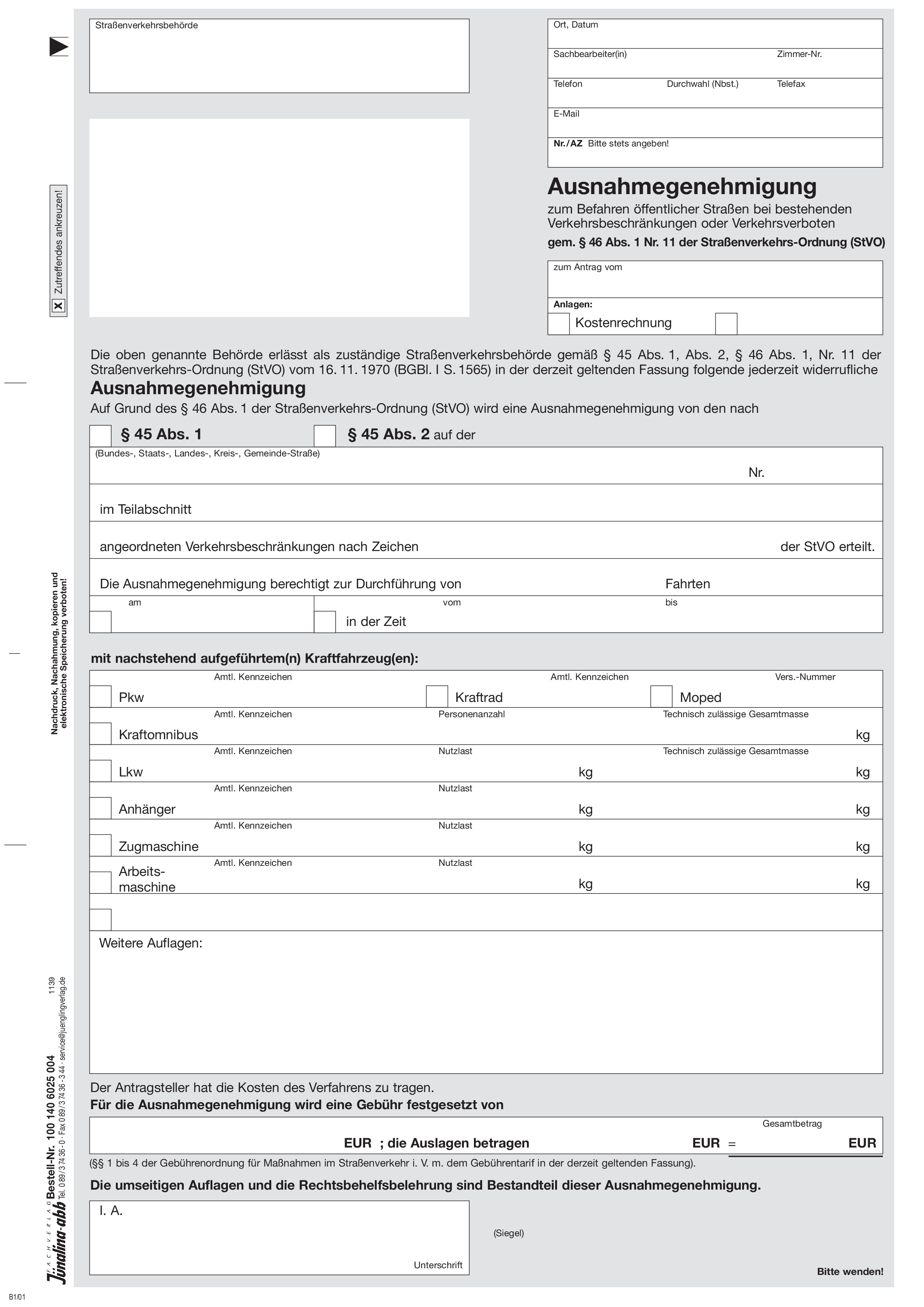 Die Ausnahmegenehmigung nach § 46 Abs. 1 Nr. 11 StVO ermöglicht das Befahren bei Verkehrsbeschränkungen. Dieses Formular im Format A4 ist vierfach selbstdurchschreibend (SD) und in den Farben weiß, blau, grün und rosa erhältlich. Es ist für die Dokumentation von Ausnahmeregelungen im Straßenverkehr besonders geeignet.