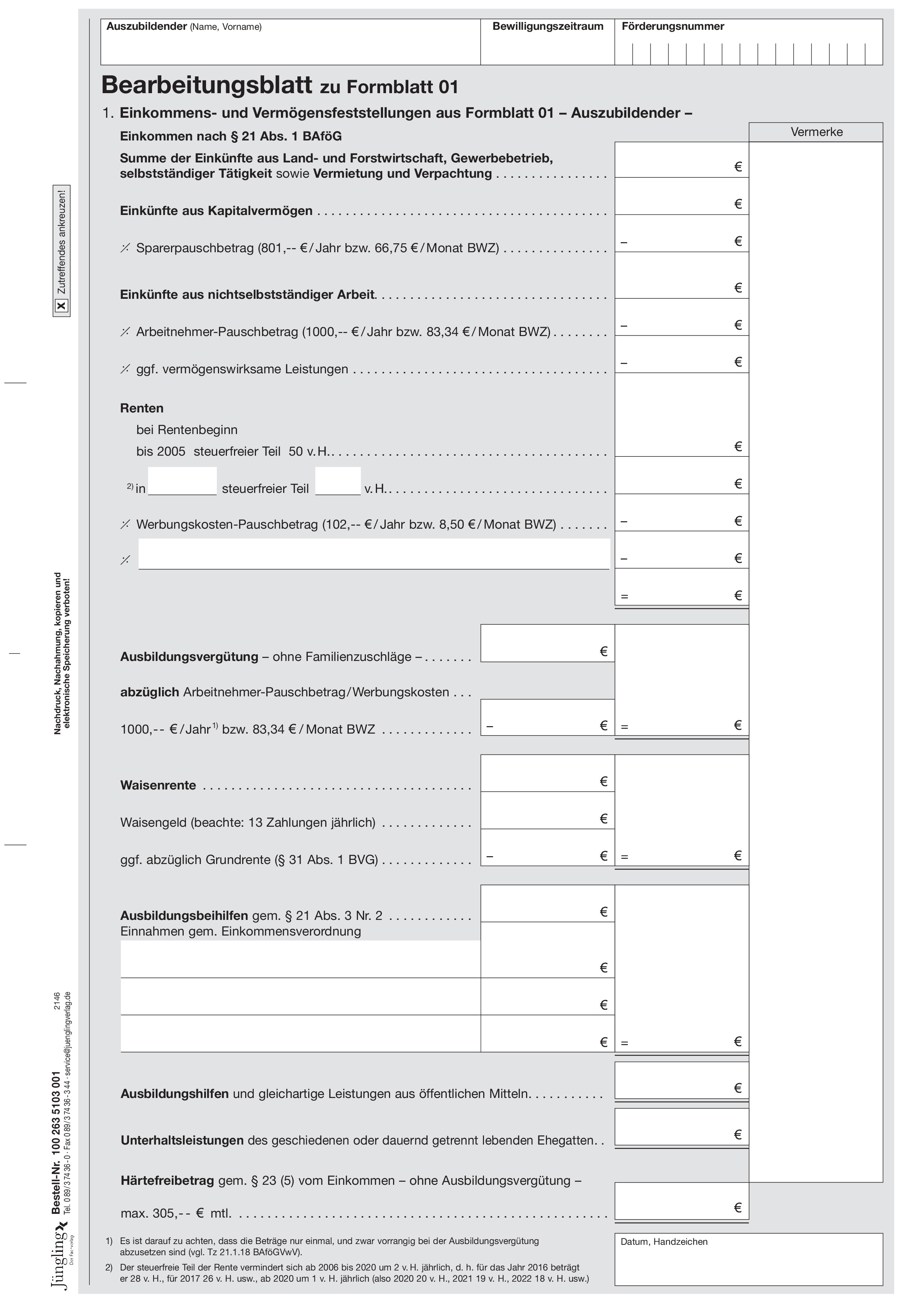 Dieses Bearbeitungsblatt dient zur Berechnung des Einkommens von Azubis sowie deren Eltern oder Ehegatten und steht in Bezug zu den Formblättern 01 und 03. Durch die praktische 4-seitige Gestaltung und die Lochung passt es perfekt in Ihre Aktenordnung.