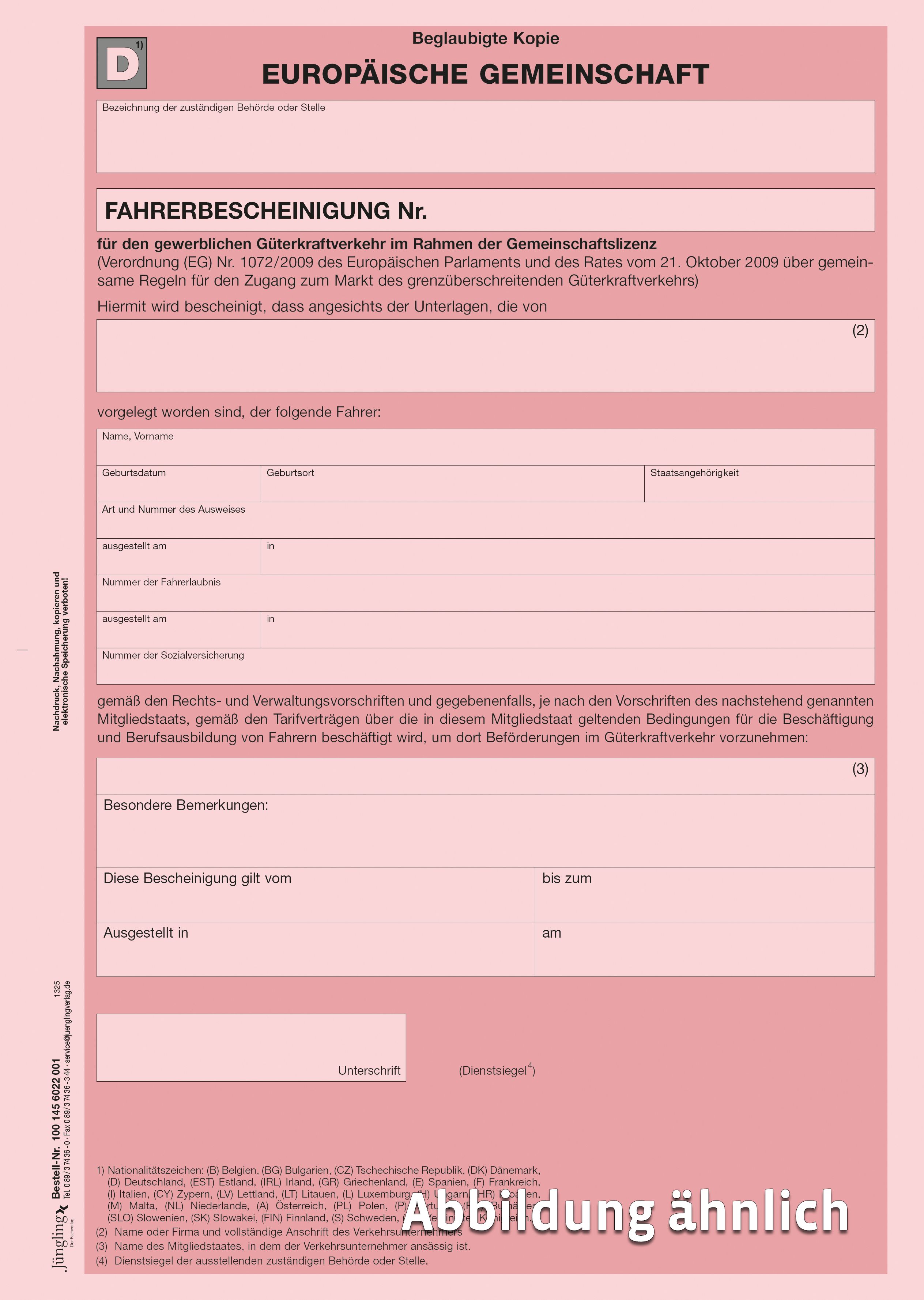 Beglaubigte Kopie der EG-Fahrerbescheinigung, Pantone rosa 182c, A4