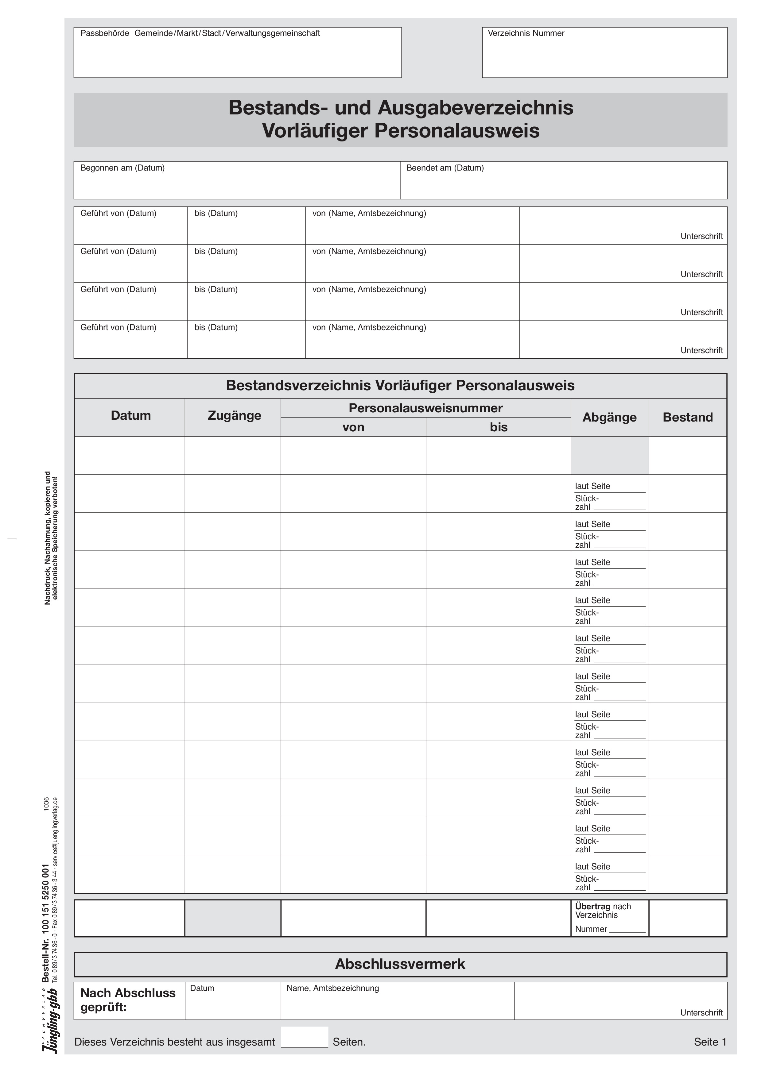 Produktinformationen "Bestands- und Ausgabeverzeichnis Vorläufiger Personalausweis Titelbogen"