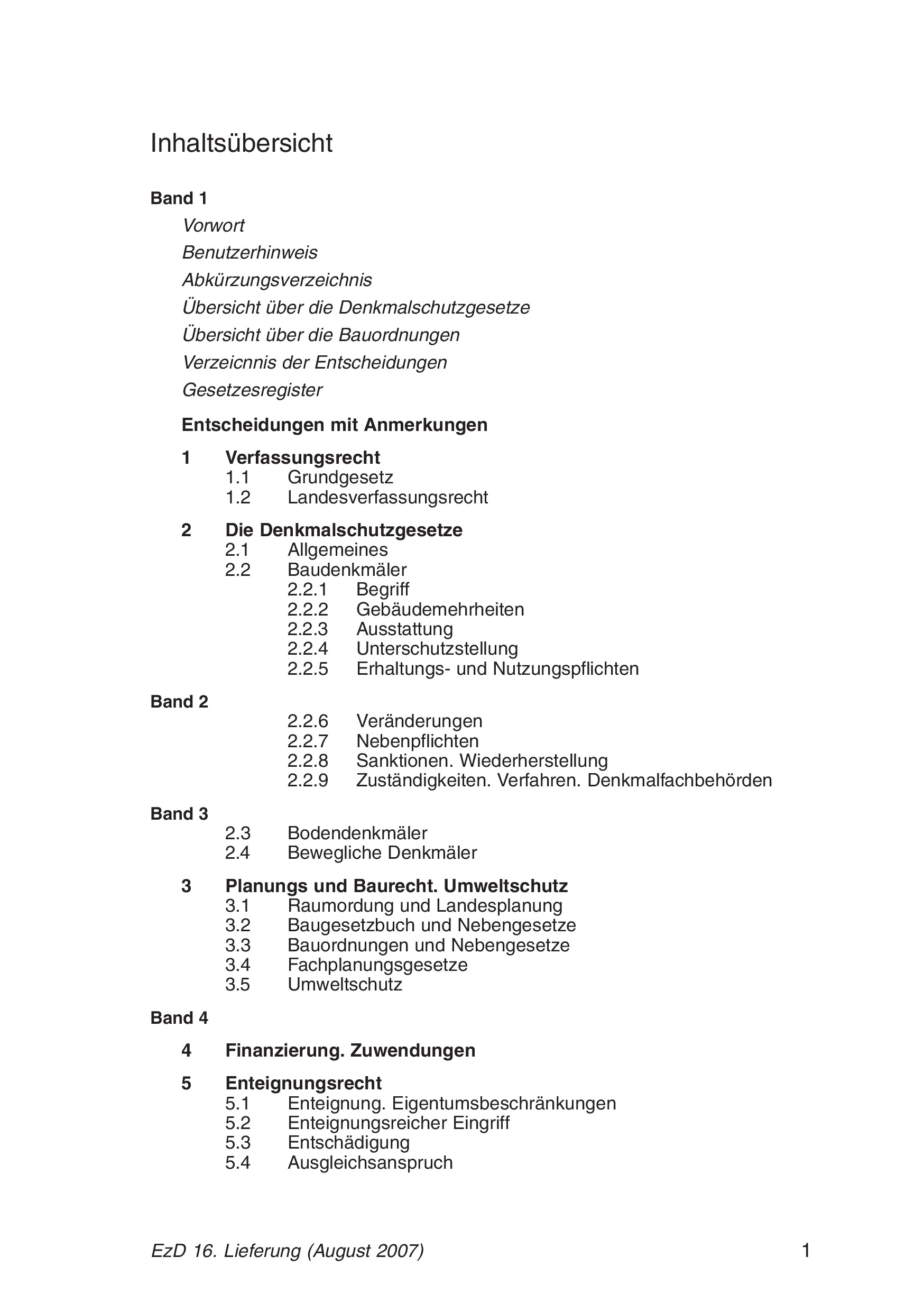 Die Loseblattsammlung enthält eine Auswahl veröffentlichter und unveröffentlichter Gerichtsentscheidungen aus sämtlichen Gebieten des Bundes- und Landesrechts, die den Denkmalschutz betreffen(namentlich Bauleitplanungs- und Bauordnungsrecht, Fachplanungsrecht, Enteignungs- und Entschädigungsrecht sowie Steuerrecht).