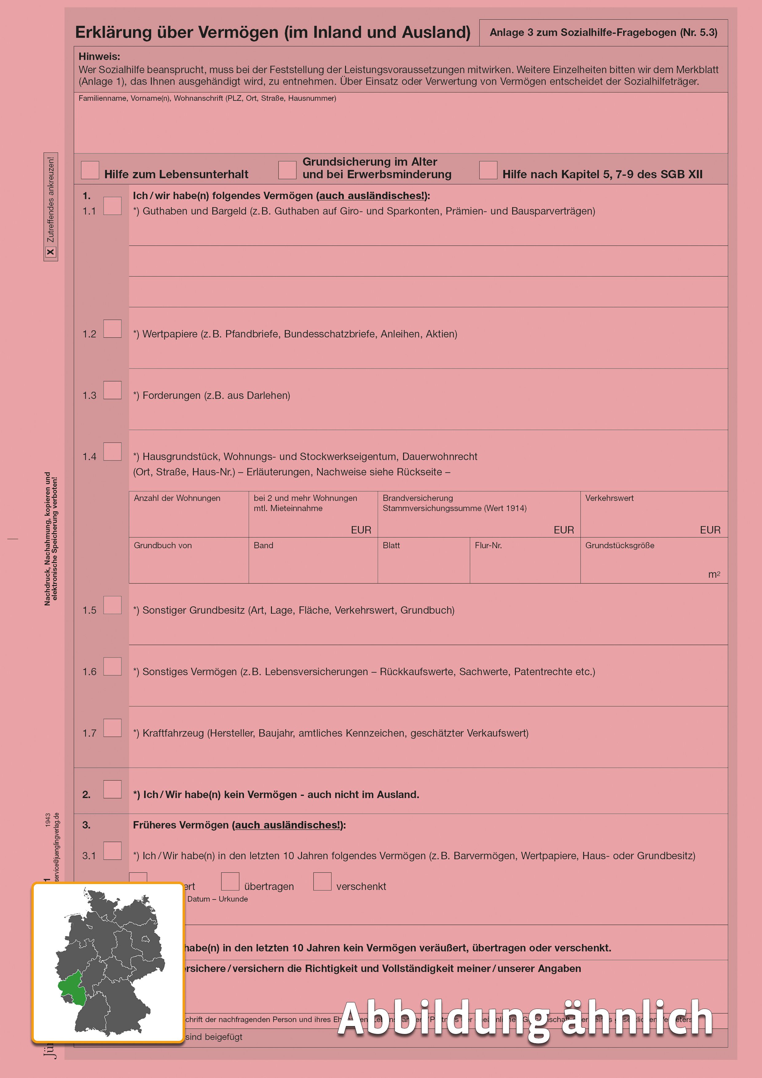 Diese Erklärung über Vermögen dient als Anlage zum Antrag 107 410 1001 001 und hilft bei der strukturierten Erfassung von Vermögenswerten. Das Formular ist im DIN A4-Format und in rosa gehalten.
