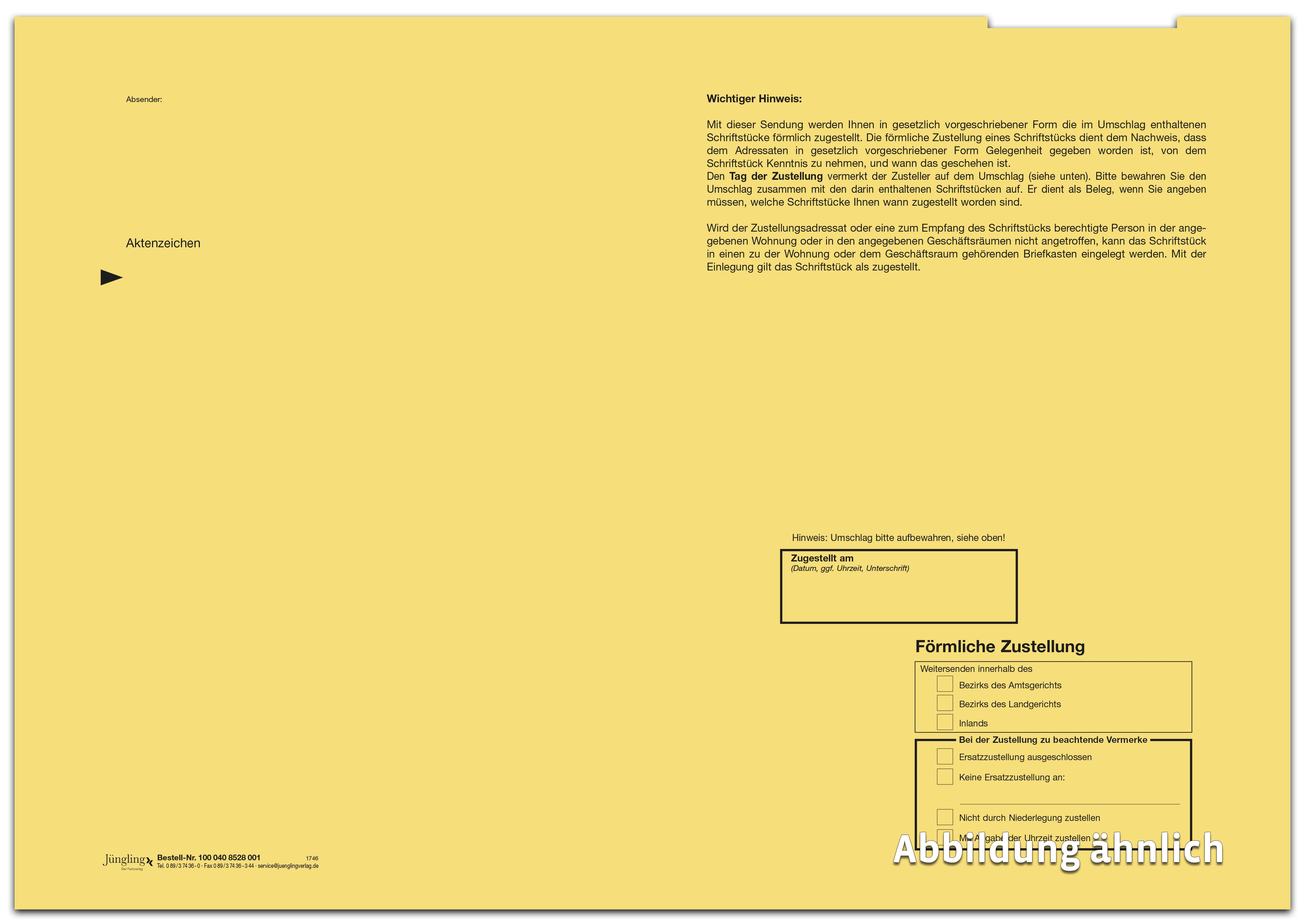 Stand: Zustellungsvordruckverordnung (BGBl. 2002 I Nr. vom 12. Februar): Die Vordrucke nach den Anlagen 1 (Zustellungsurkunde) und 2 (Innerer Umschlag) jeweils in der bis einschließlich 31. Juli 2025 geltenden Fassung können bis einschließlich 31. Juli 2026 weiterverwendet werden.