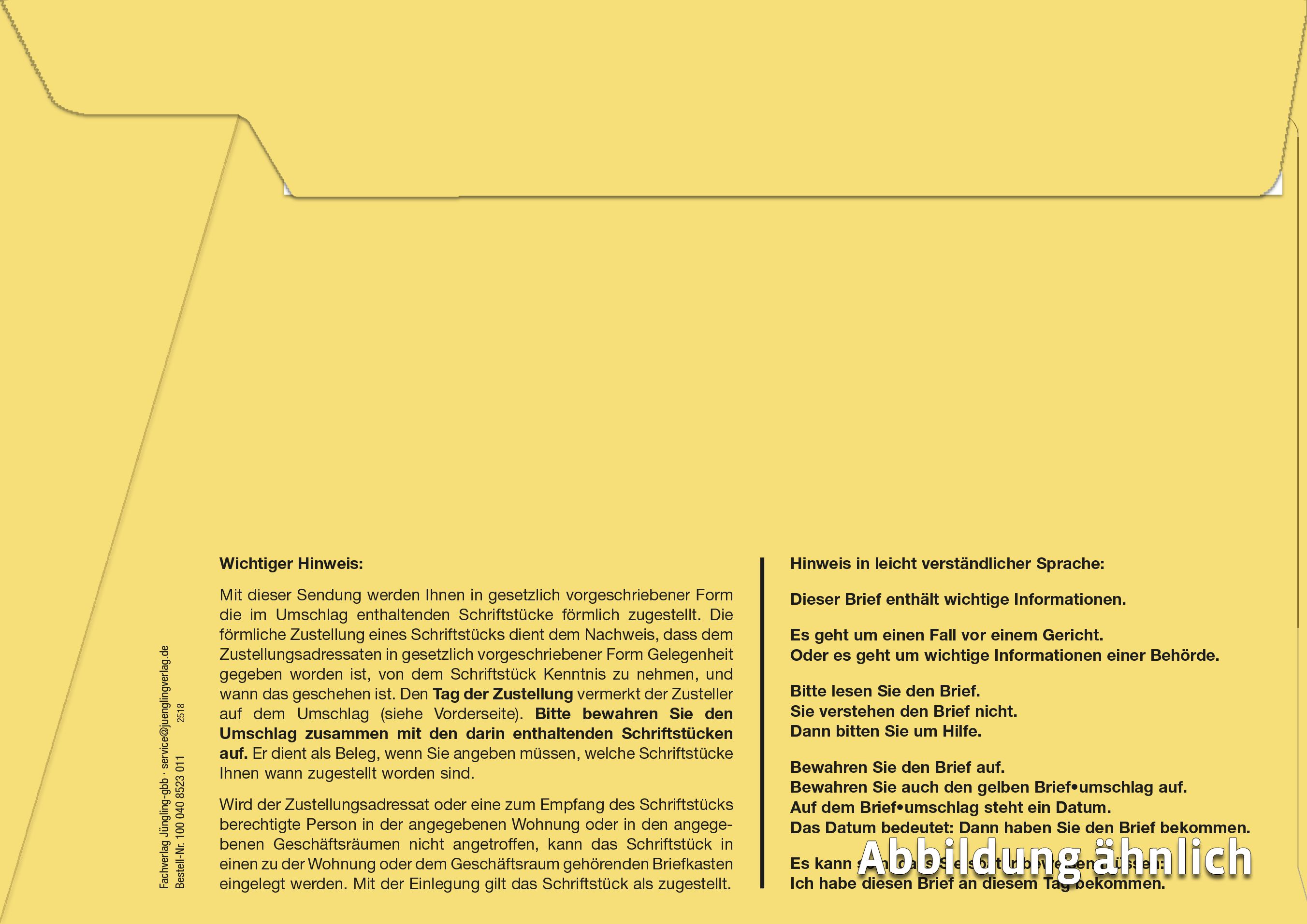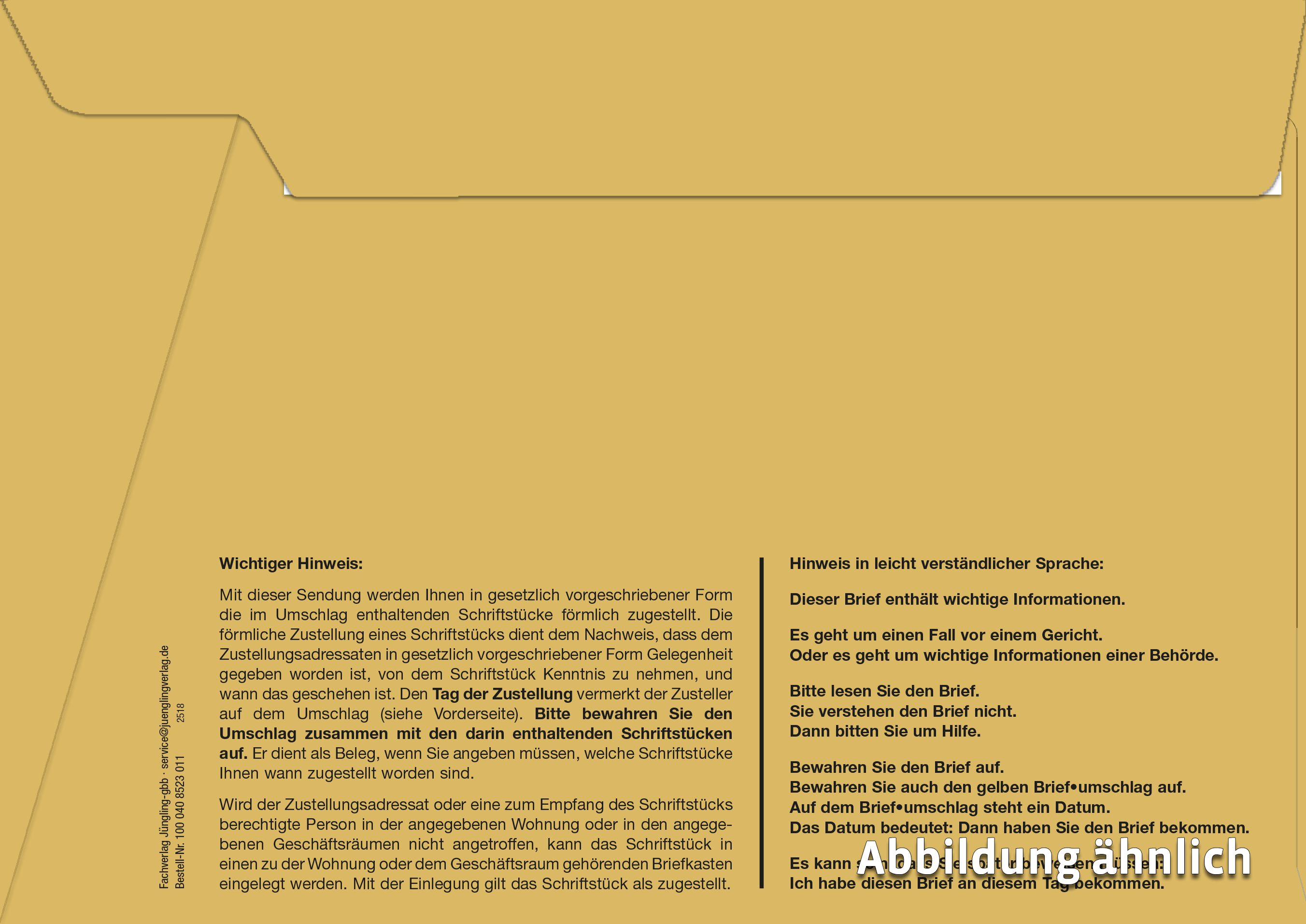 Der innere Umschlag DIN C5 ist speziell für die förmliche Zustellung konzipiert und erfüllt alle gesetzlichen Anforderungen. Der Umschlag verfügt über ein praktisches Fenster, das eine direkte Sicht auf den Inhalt ermöglicht.