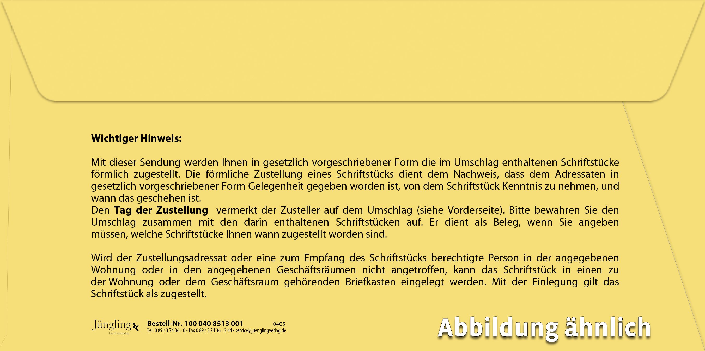 Der innere Umschlag richtet sich an alle deutschen Behörden und Institutionen, die förmliche Zustellungen vornehmen müssen. Aufgrund seiner standardisierten Größe und Haftklebung ist er überaus praktisch und zuverlässig.