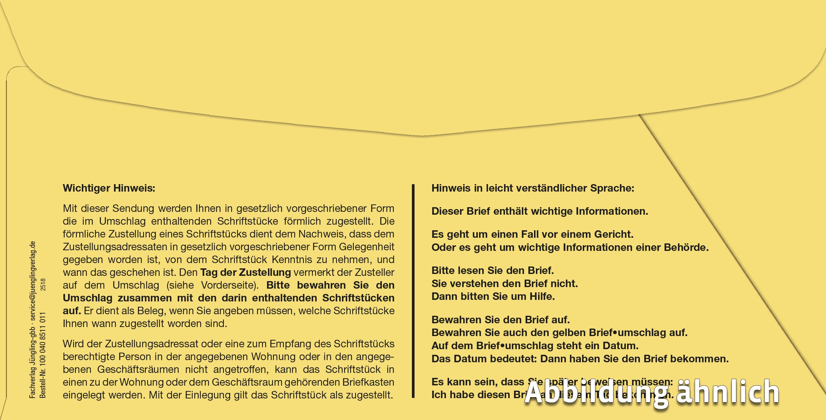 Dieser innere Umschlag ist speziell für die förmliche Zustellung von Kompaktbriefen ausgelegt. Mit einer Größe von 114 x 224 mm bietet er optimale Voraussetzungen für einen sicheren Versand.