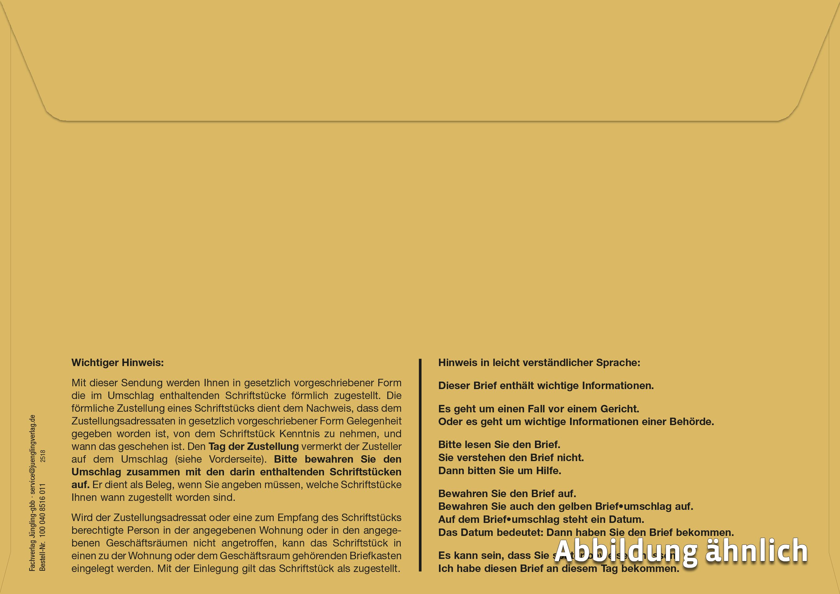 Innerer Umschlag DIN C5 für die förmliche Zustellung. Der Umschlag ist gelb, ohne Fenster, nassklebend und maschinell kuvertierbar. Zusätzlich bietet er ein Kohlepapier und einen Einsteckschlitz.