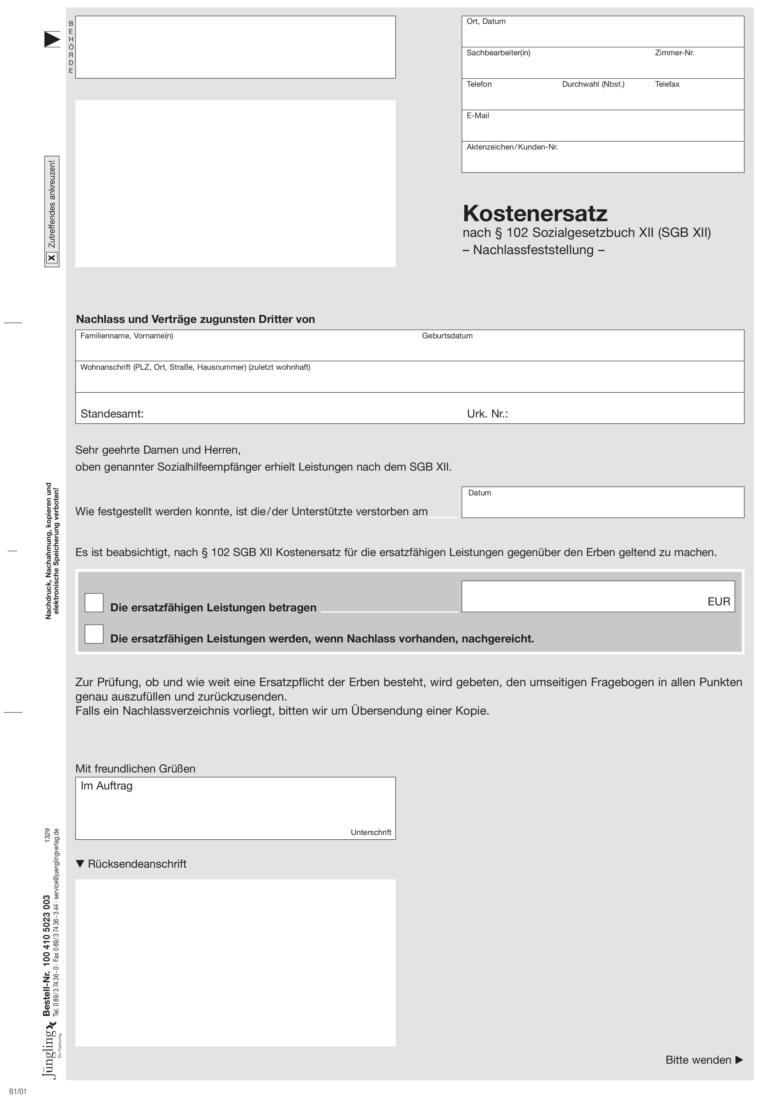 Dieses Formular unterstützt die Nachlassfeststellung bei Nachlassgerichten gemäß § 102 SGB XII. Es ist im Format A4 (210 x 297 mm) und besteht aus drei Durchschlägen (SD) in den Farben weiß, blau und rosa. Die Bindung erfolgt mittels Stumpfleimung am Kopf.