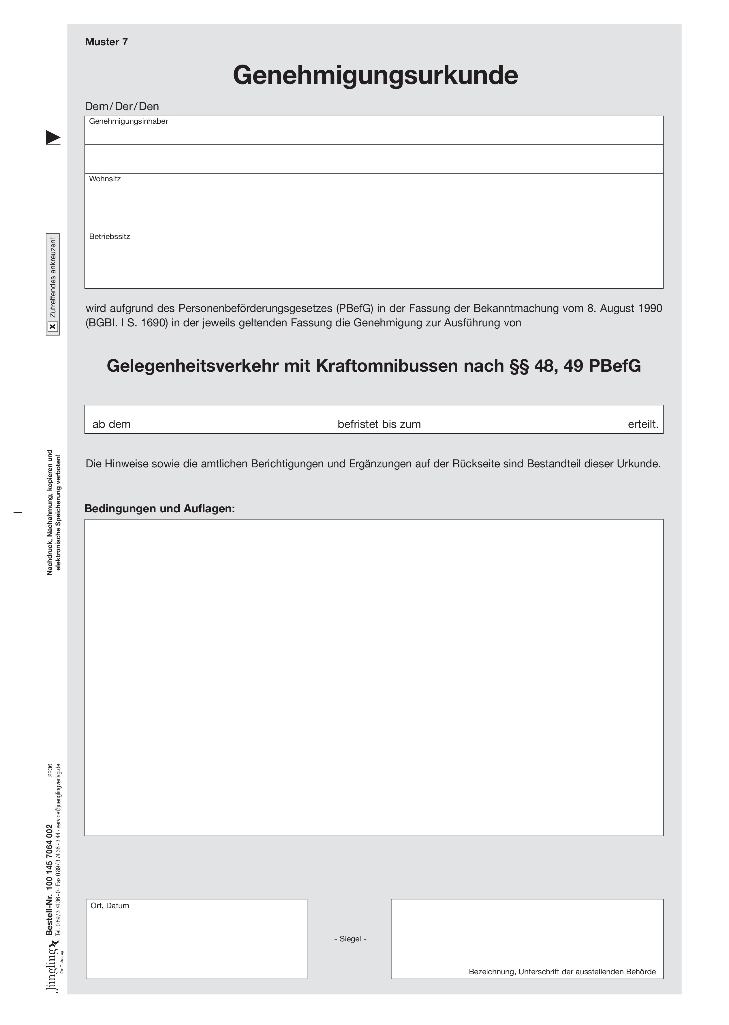 Produktinformationen "Genehmigungsurkunde Gelegenheitsverkehr mit Kraftomnibussen, Muster 7"