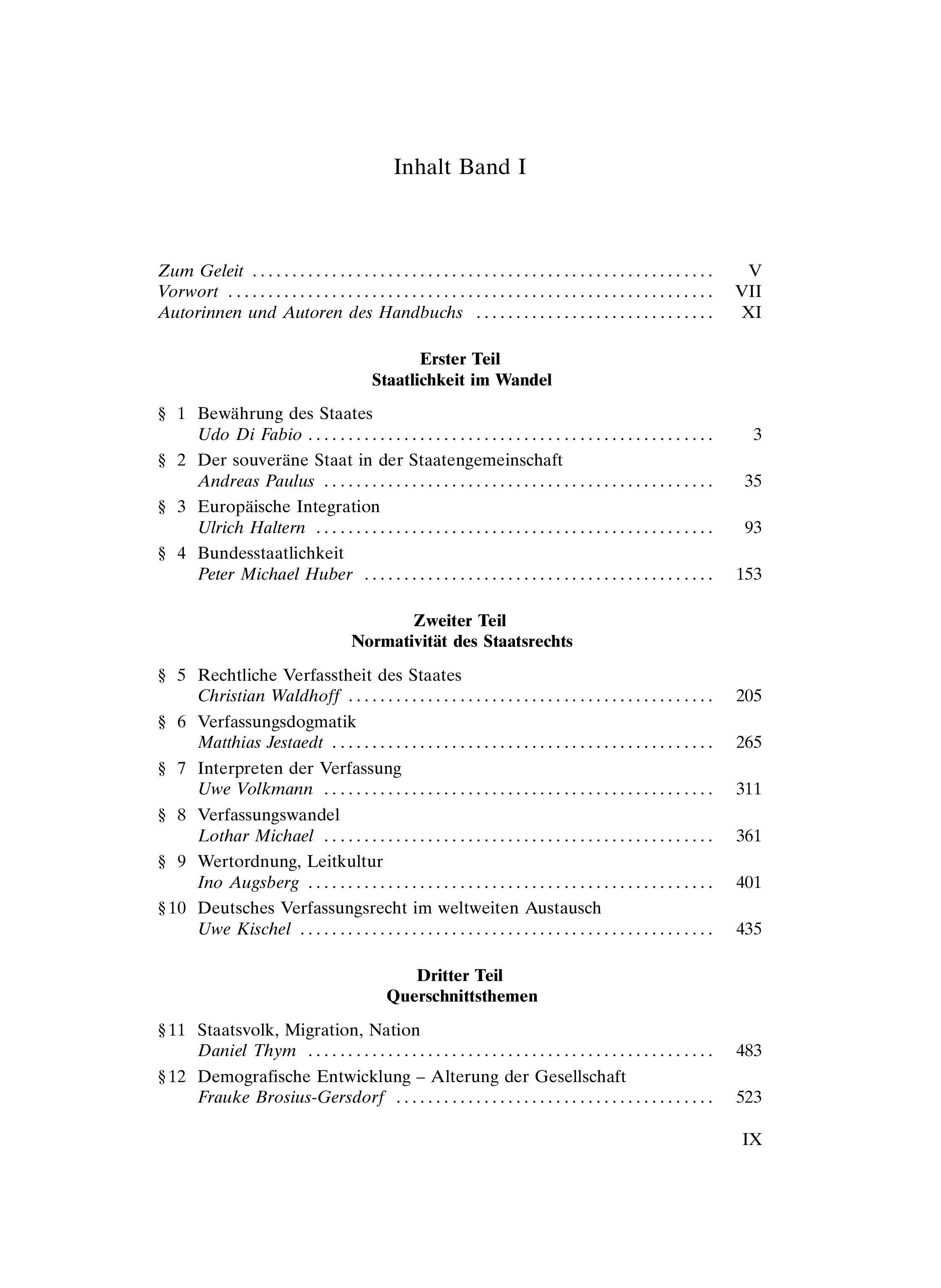 Band I zu „Grundlagen, Wandel und Herausforderungen“ des Staatsrechts formuliert übergreifende Leitgedanken und setzt damit zugleich programmatische Akzente für die Konzeption der Neuen Handbuchs des Staatsrechts insgesamt, die in den folgenden Bänden in ihren vielfältigen Einzelaspekten vertiefend und ergänzend wieder aufgegriffen werden. Quasi vor die Klammer gezogen werden die heutigen Herausforderungen und Zukunftsthemen des Staatsrechts beleuchtet: