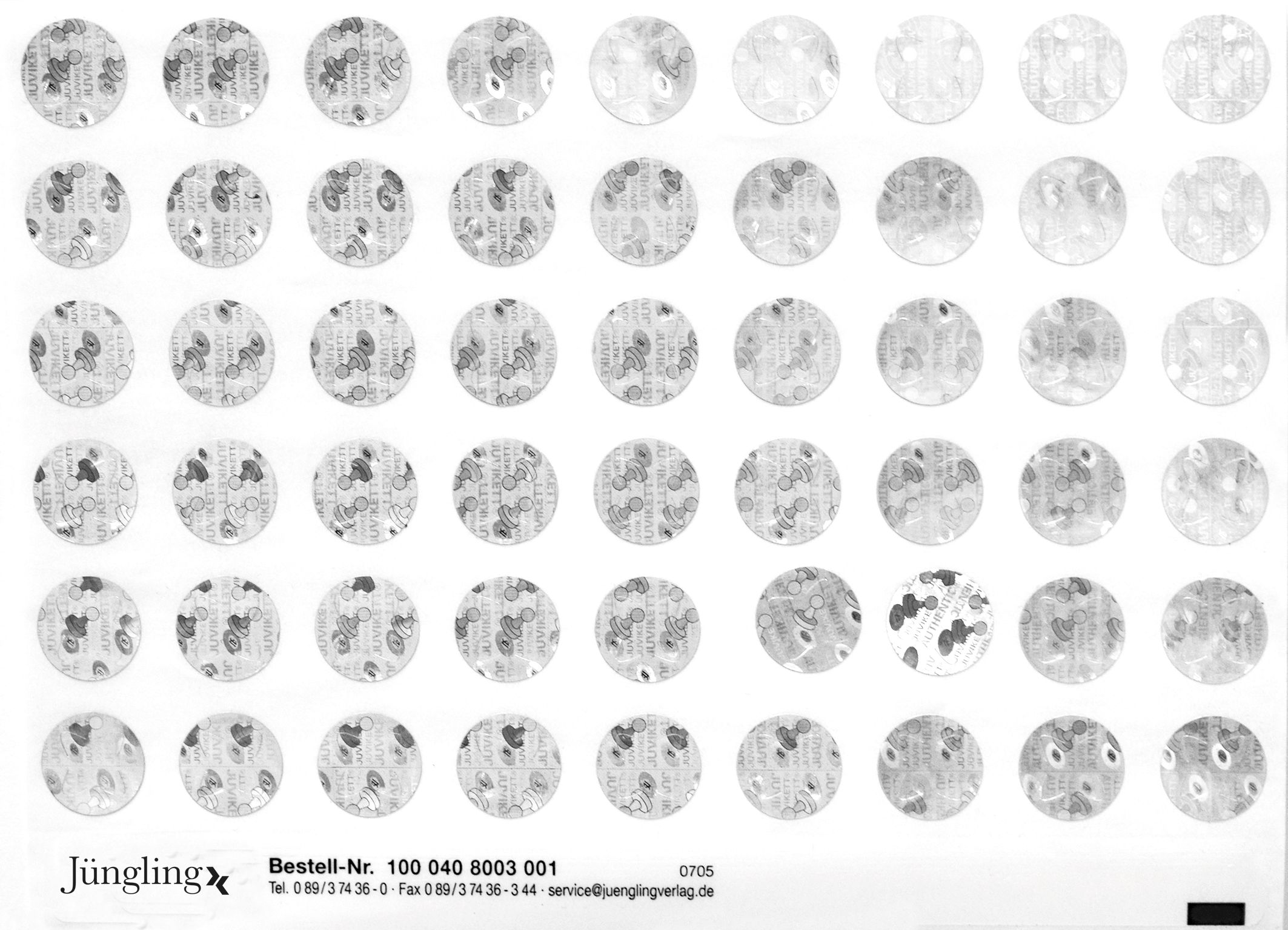 Der Hologrammbogen im Format 143,9 x 105,00 enthält 54 runde Hologrammetiketten mit einem Durchmesser von 12mm. Diese Etiketten sind ideal für die Erhöhung der Fälschungssicherheit bei Dokumenten und Urkunden.