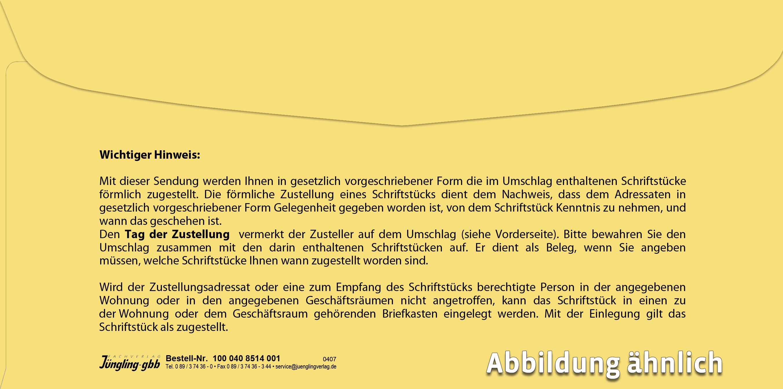 Stand: Zustellungsvordruckverordnung (BGBl. 2002 I Nr. vom 12. Februar): Die Vordrucke nach den Anlagen 1 (Zustellungsurkunde) und 2 (Innerer Umschlag) jeweils in der bis einschließlich 31. Juli 2025 geltenden Fassung können bis einschließlich 31. Juli 2026 weiterverwendet werden.