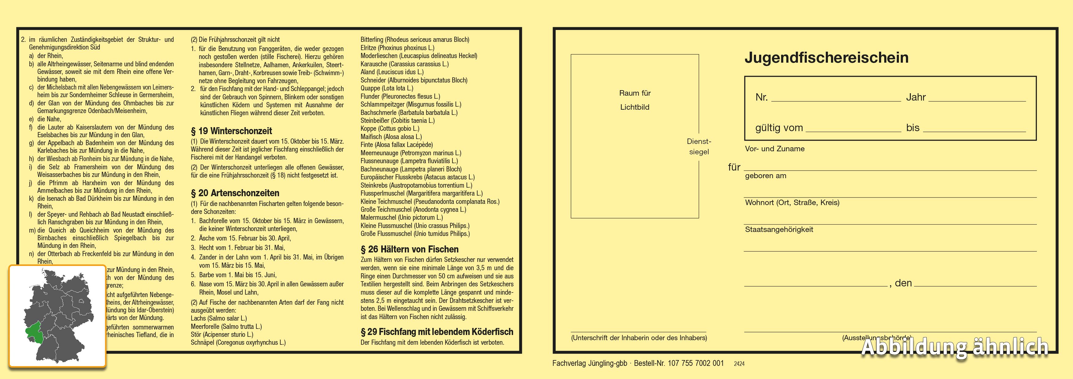 Der Jugendfischereischein im Format 297 x 105 mm ist ideal für Behörden und Organisationen, die Jugendangelscheine ausstellen. Er besteht aus einem Blatt, das auf gelbem Schreibleinenpapier beidseitig bedruckt ist.