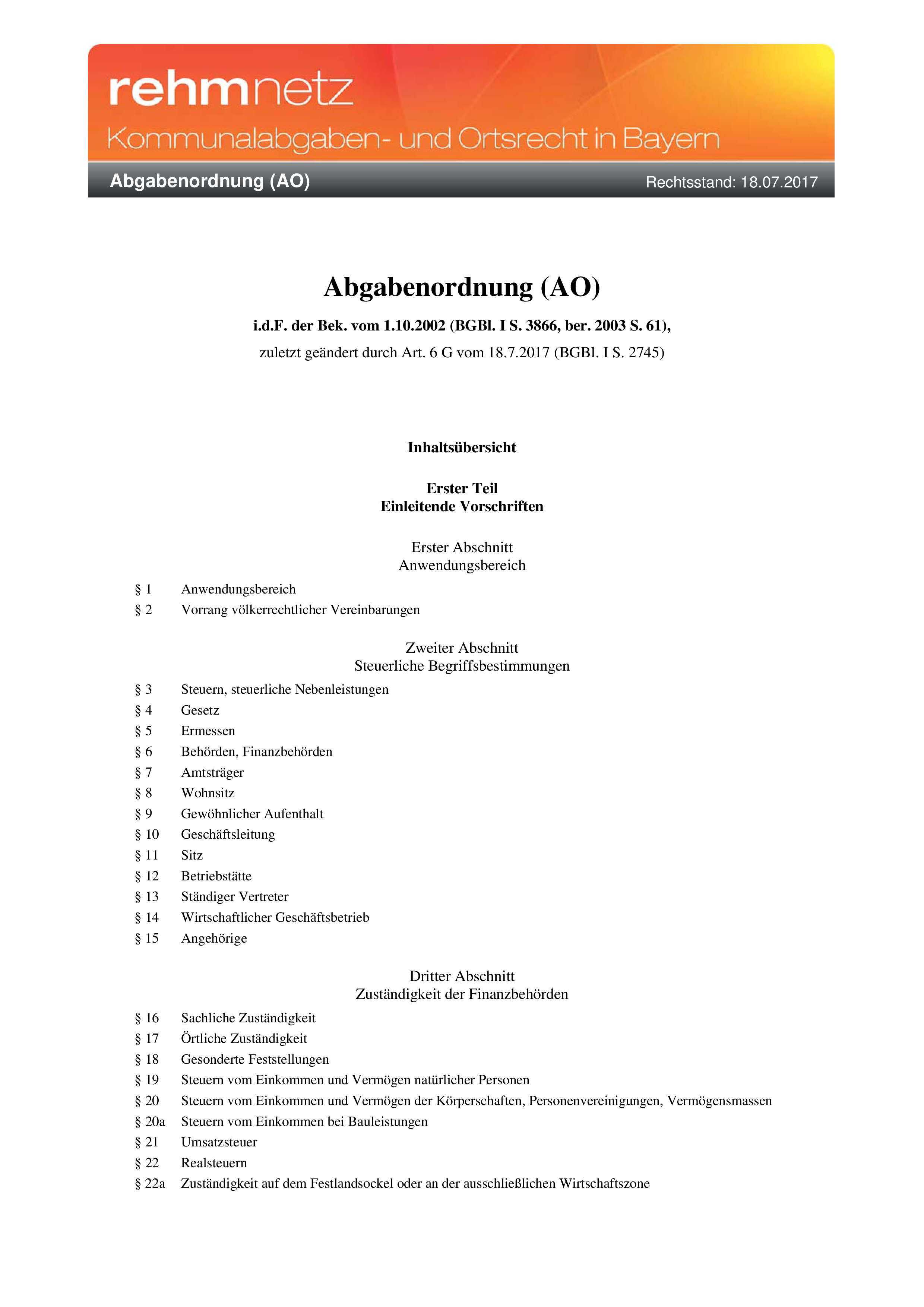 - Teil VII stellt die im KAG anwendbaren Auszüge der Abgabenordnung bereit.