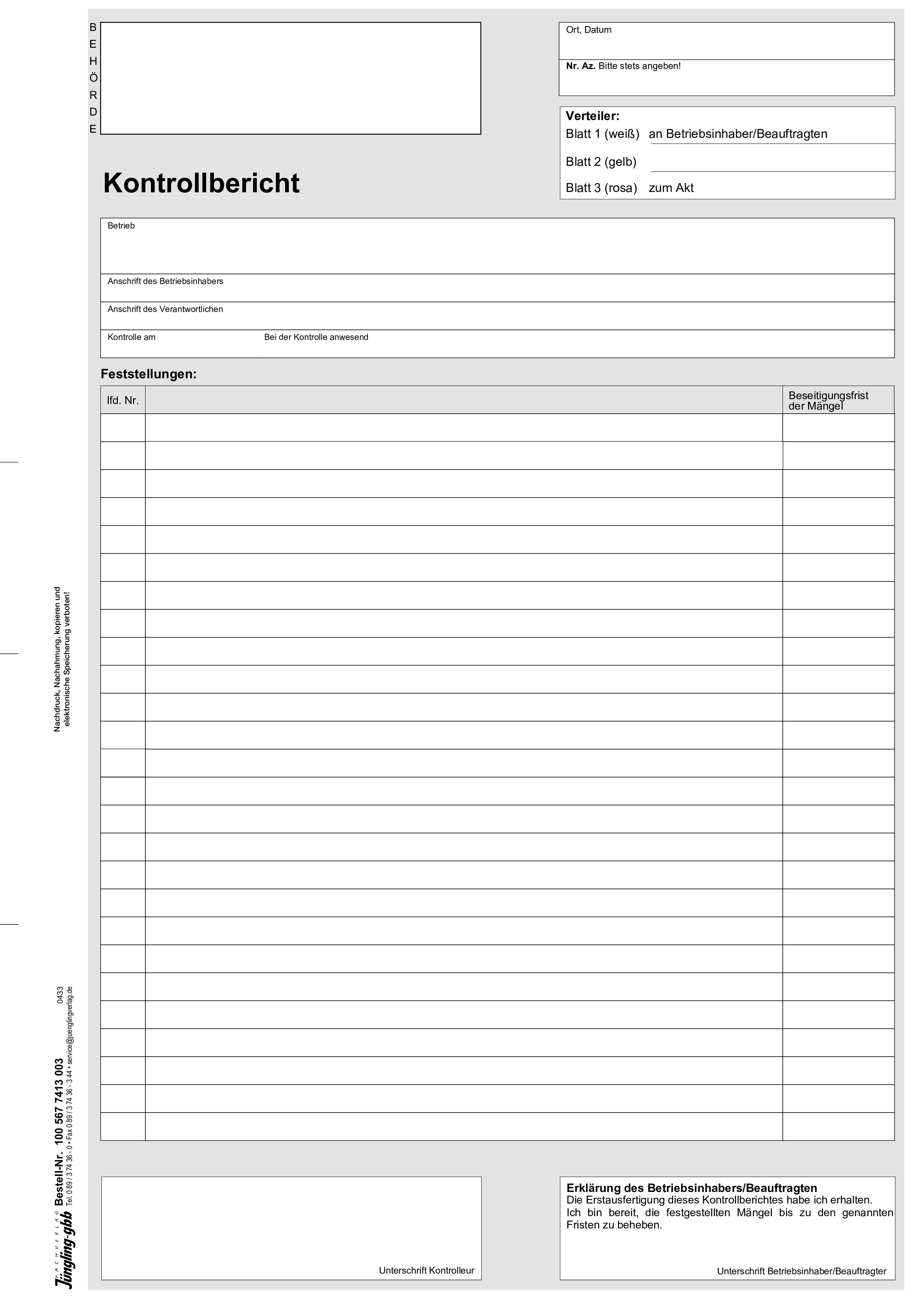Dieser Kontrollbericht richtet sich an Lebensmittelüberwachungsbehörden, die eine effiziente und übersichtliche Dokumentation ihrer Inspektionen benötigen. Durch die dreifache Ausfertigung in unterschiedlichen Farben (weiß, gelb, rosa) können Original und Kopien leicht unterschieden und verwaltet werden.