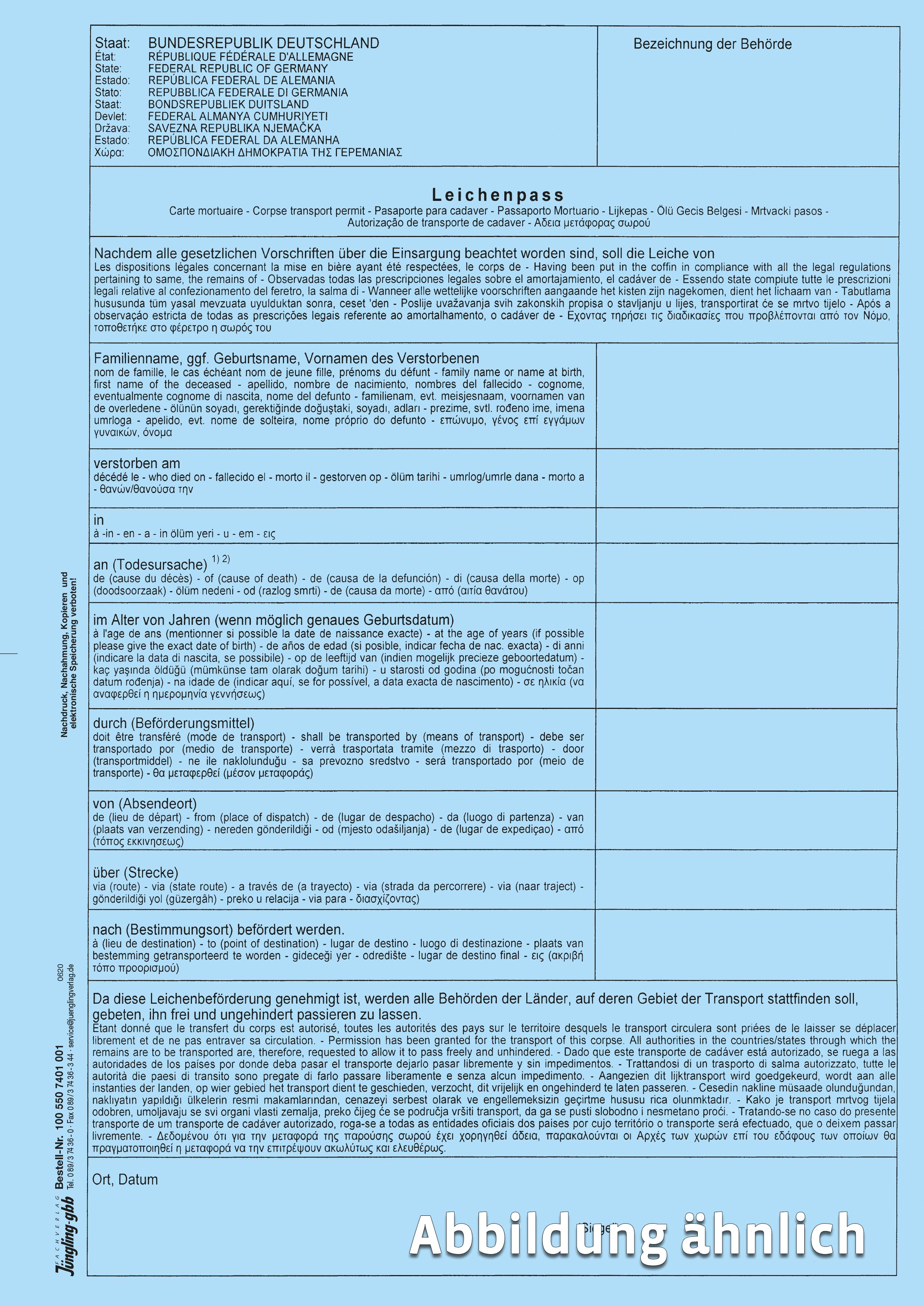Leichenpass, A4 blau, 2-seitig, 10-sprachig