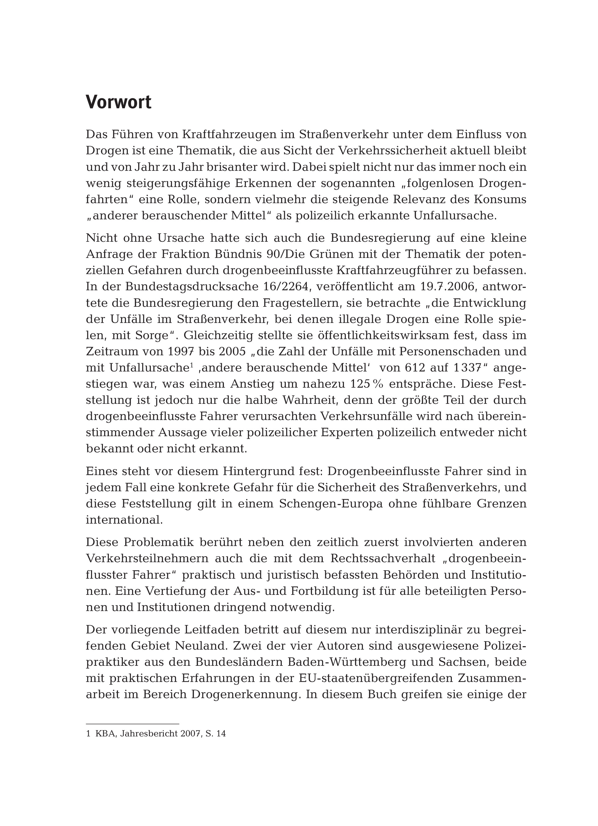 Das Führen von Kraftfahrzeugen im Straßenverkehr unter dem Einfluss von Drogen ist eine Thematik, die aus Sicht der Verkehrssicherheit von Jahr zu Jahr immer brisanter wird. Damit die von den drogenbeeinflussten Fahrern ausgehenden Verkehrsgefahren vermindert werden können, bedarf es einer konsequenten Bearbeitung durch alle Personen, die mit der Ahndung von Verkehrsdelikten betraut sind.