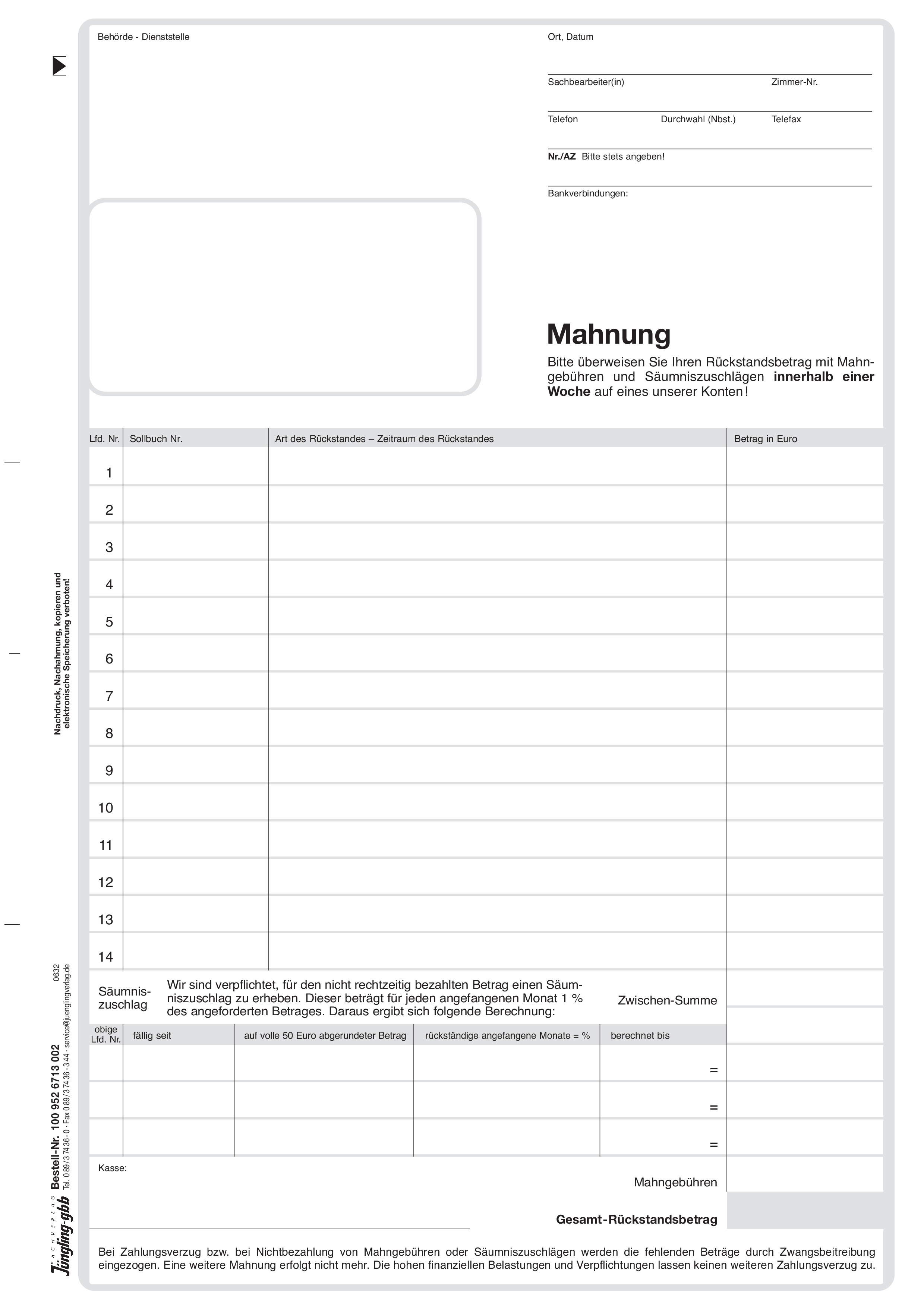 Dieses zweifach-SD-Formular im DIN A4 Format ist ideal für die Erstellung von Mahnungen. Es ist auf hochwertigem weiß/rosa Papier gedruckt und bietet die Möglichkeit eines individuellen Behördeneindrucks.