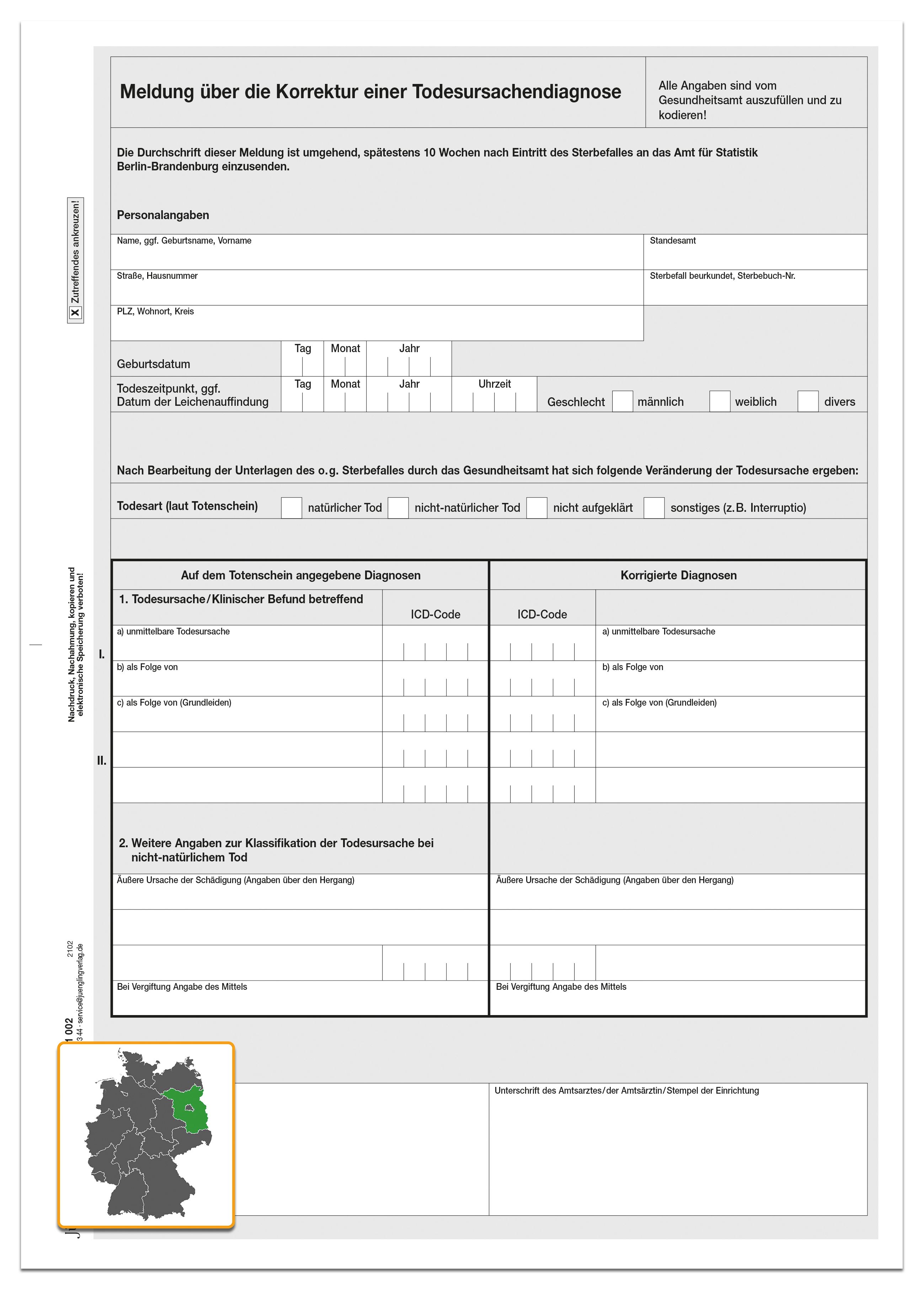 Produktinformationen "Meldung über die Korrektur einer Todesursachendiagnose (Brandenburg), A4, 2-fach, SD"
