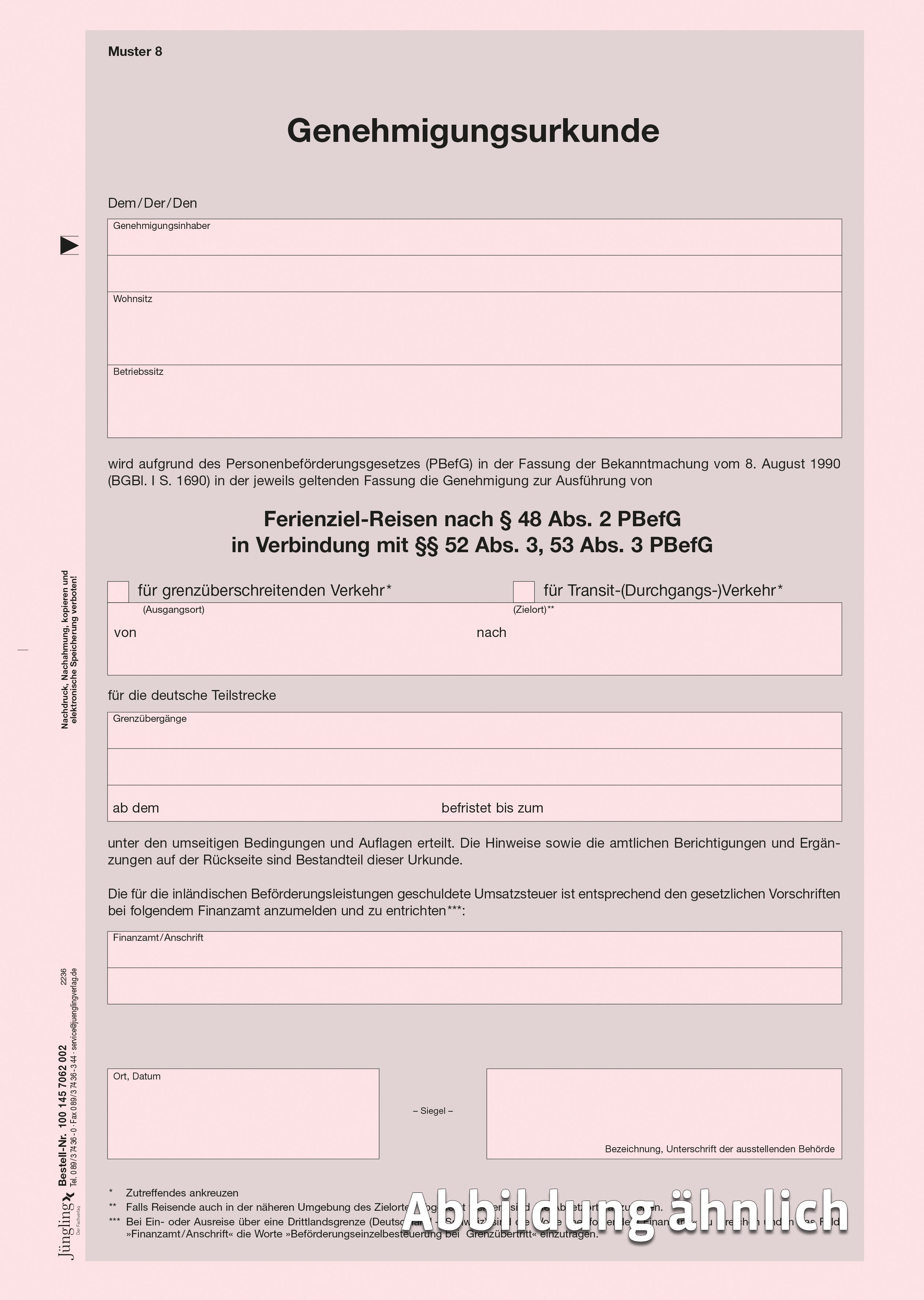 Muster 8: Genehmigungsurkunde Ferienziel-Reisen, A4, 2-fach rosa