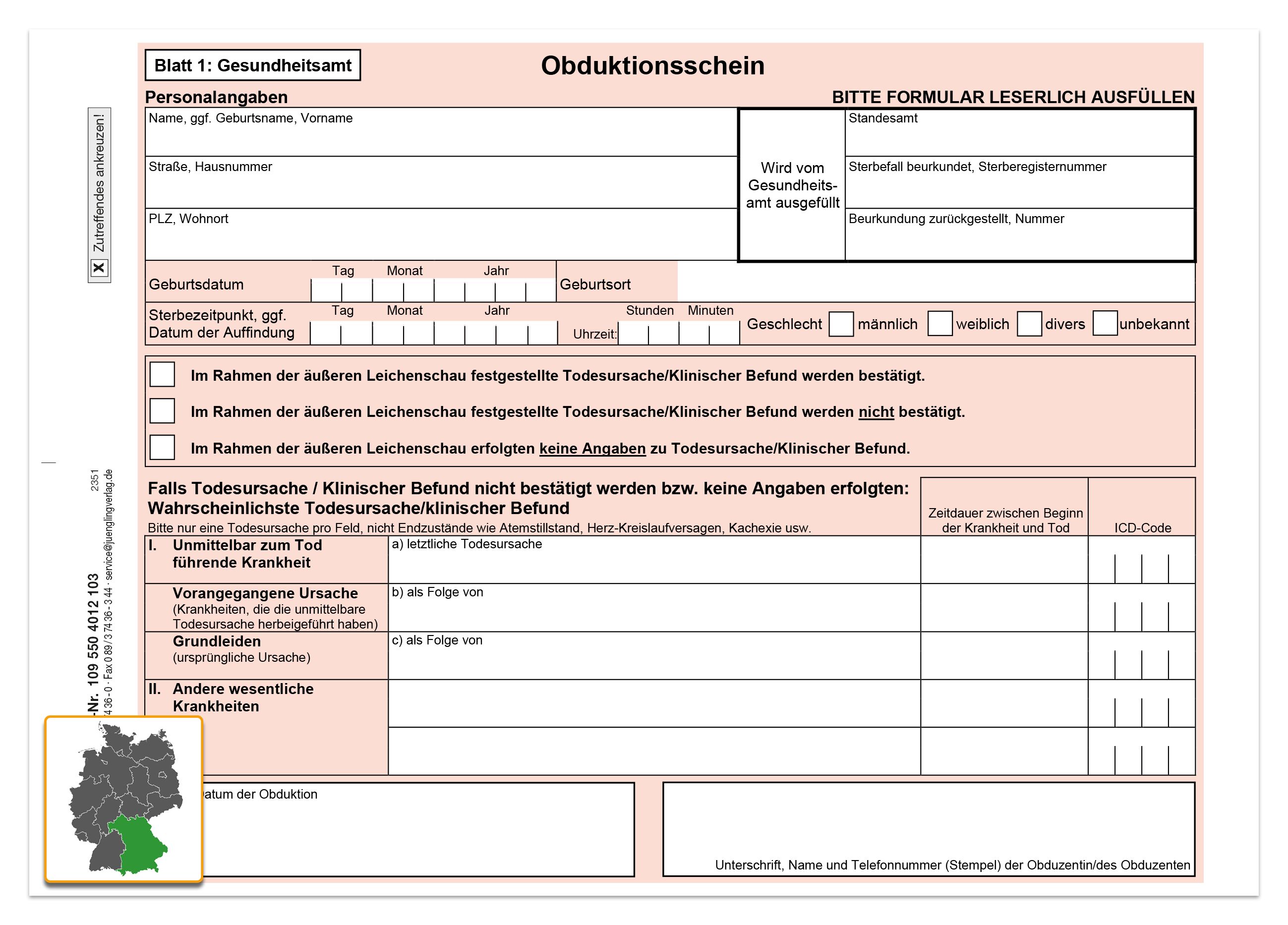Dieser Obduktionsschein richtet sich an Obduzenten und Obduzentinnen sowie an Behörden wie das Gesundheitsamt und das Statistische Landesamt in Bayern. Die durchdachte Farbgebung und dreifache Ausführung sorgen für klare und effiziente Arbeitsabläufe.