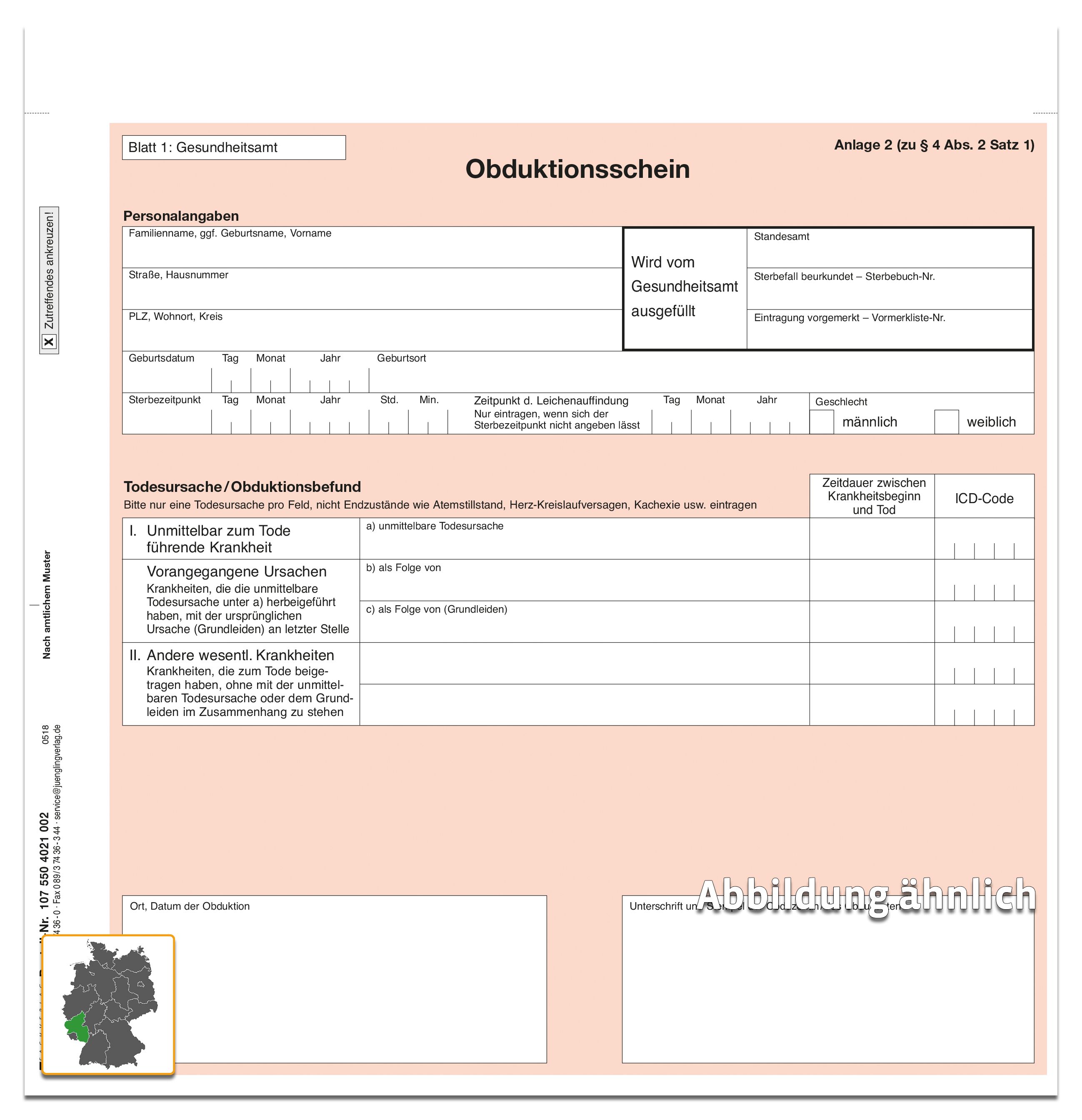 Obduktionsschein Rheinland-Pfalz, 2/3 DIN A4, 2-fach
