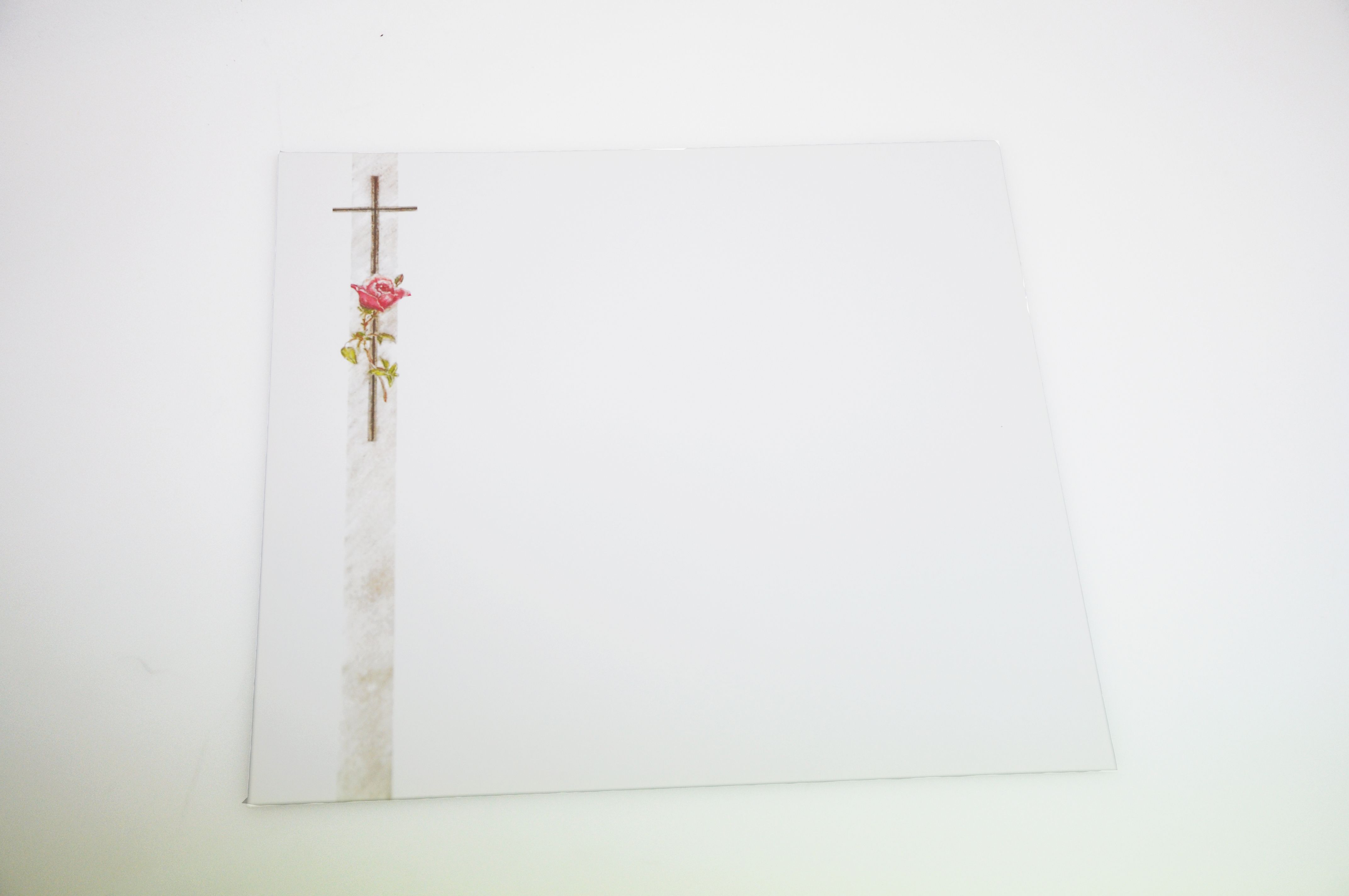 Diese Papiereinlage mit Trauermotiv ist ideal für den Einsatz bei Trauerfällen. Das Blatt ist einseitig bedruckt und überzeugt durch seine schlichte Eleganz. Mit seinen Maßen von 210 x 210 mm passt es perfekt in Trauerkarten oder -mappen.