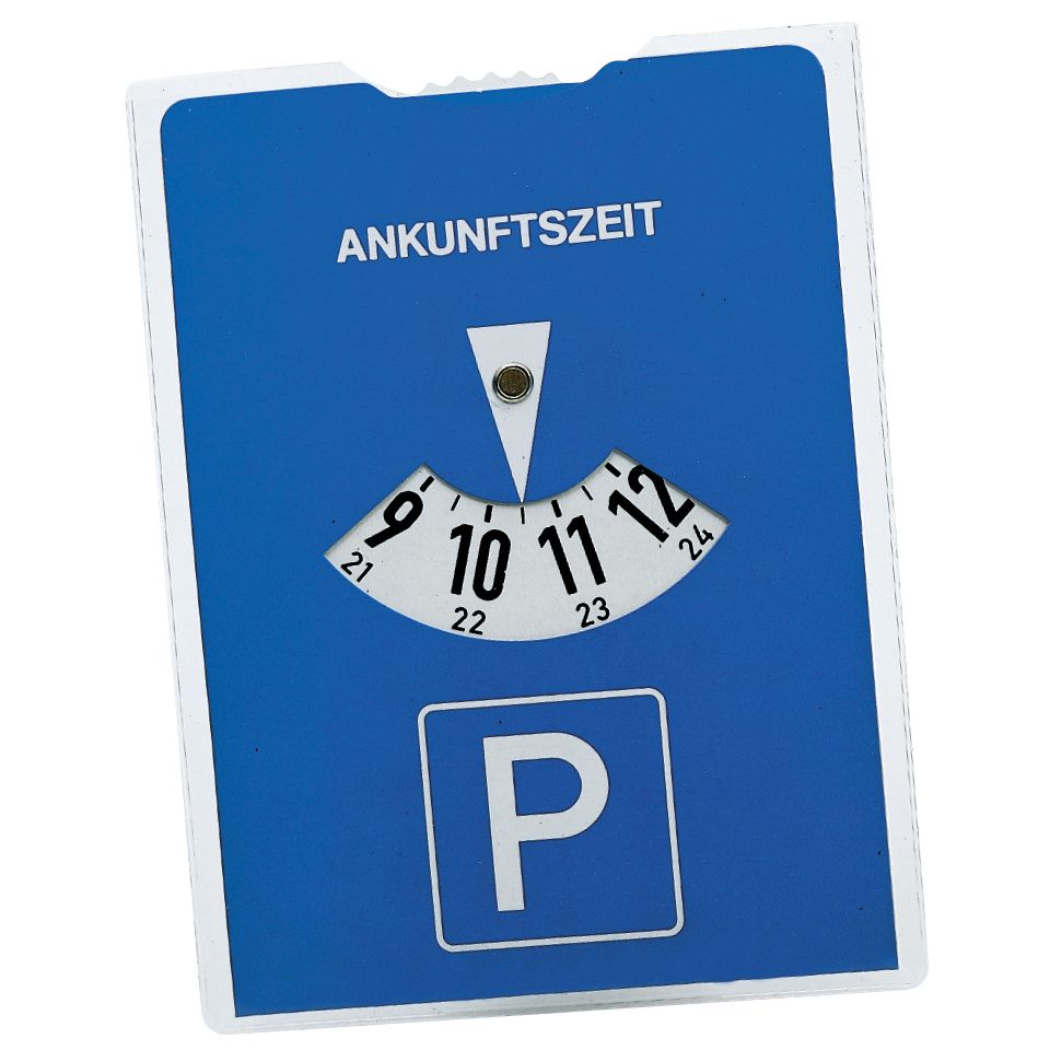 Die praktische Parkscheibe aus blauer Pappe ist ein unverzichtbares Hilfsmittel für jeden Autofahrer. Sie verfügt auf der Rückseite über einen Benzinrechner und bietet Platz für einen Stempelabdruck.