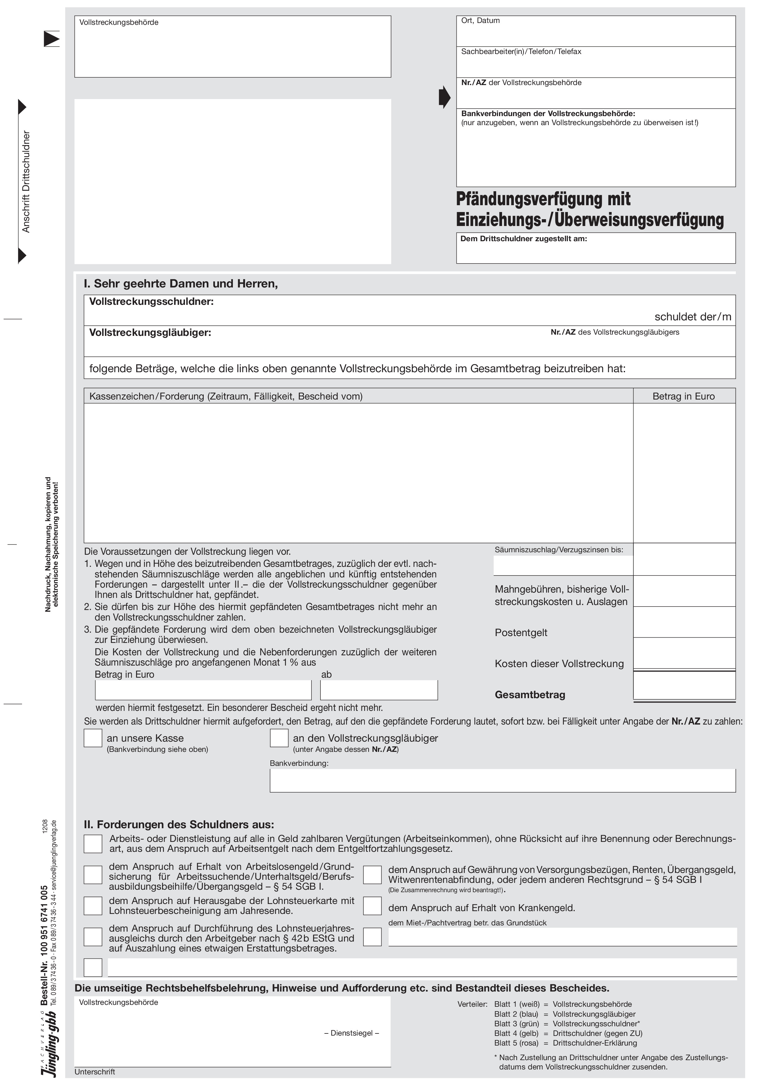 Pfändungs- und Überweisungsverfügung Lohnpfändung, A4 5-fach
