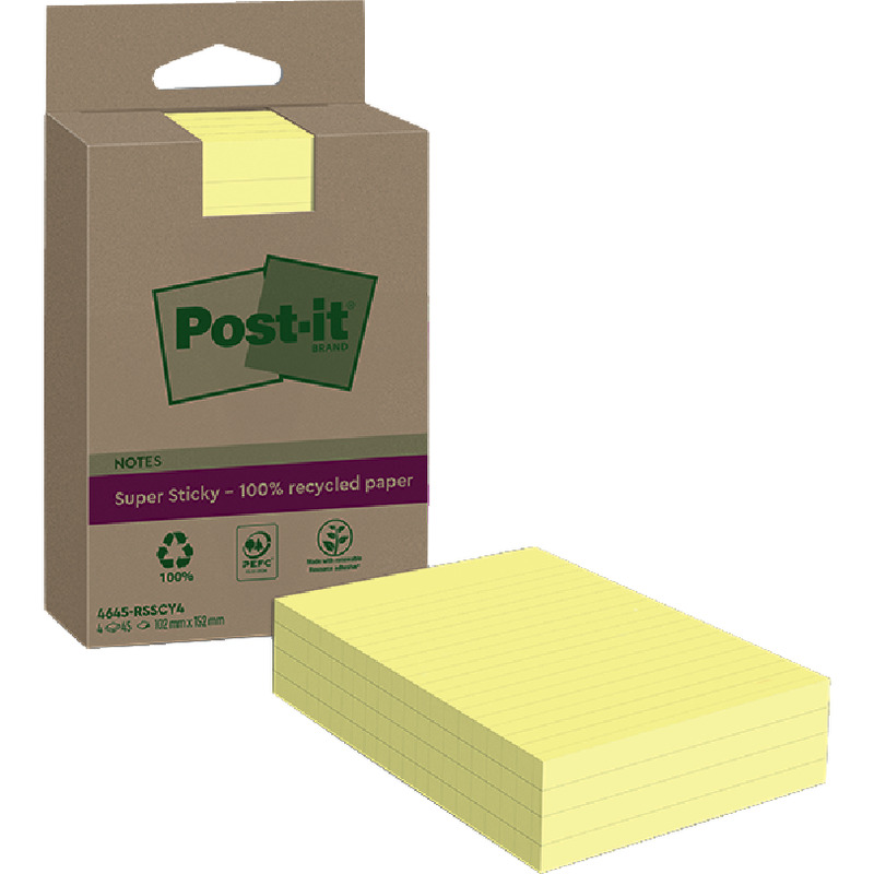 Post-it® Super Sticky 100 % Recycling Notes, Gelb, Liniert, 102 mm x 152 mm, 45 Blatt/Block, 4 Blöcke/Packung
