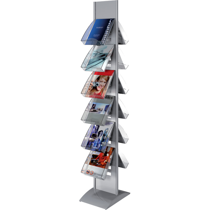 Bestehend aus zwei individuell kombinierbaren Elementen:dem eigentlichen Ständer und den Prospektflächen. In jedem Ständer können bis zu 12 Prospektfächer bei doppelseitiger Nutzung eingesetzt werden.