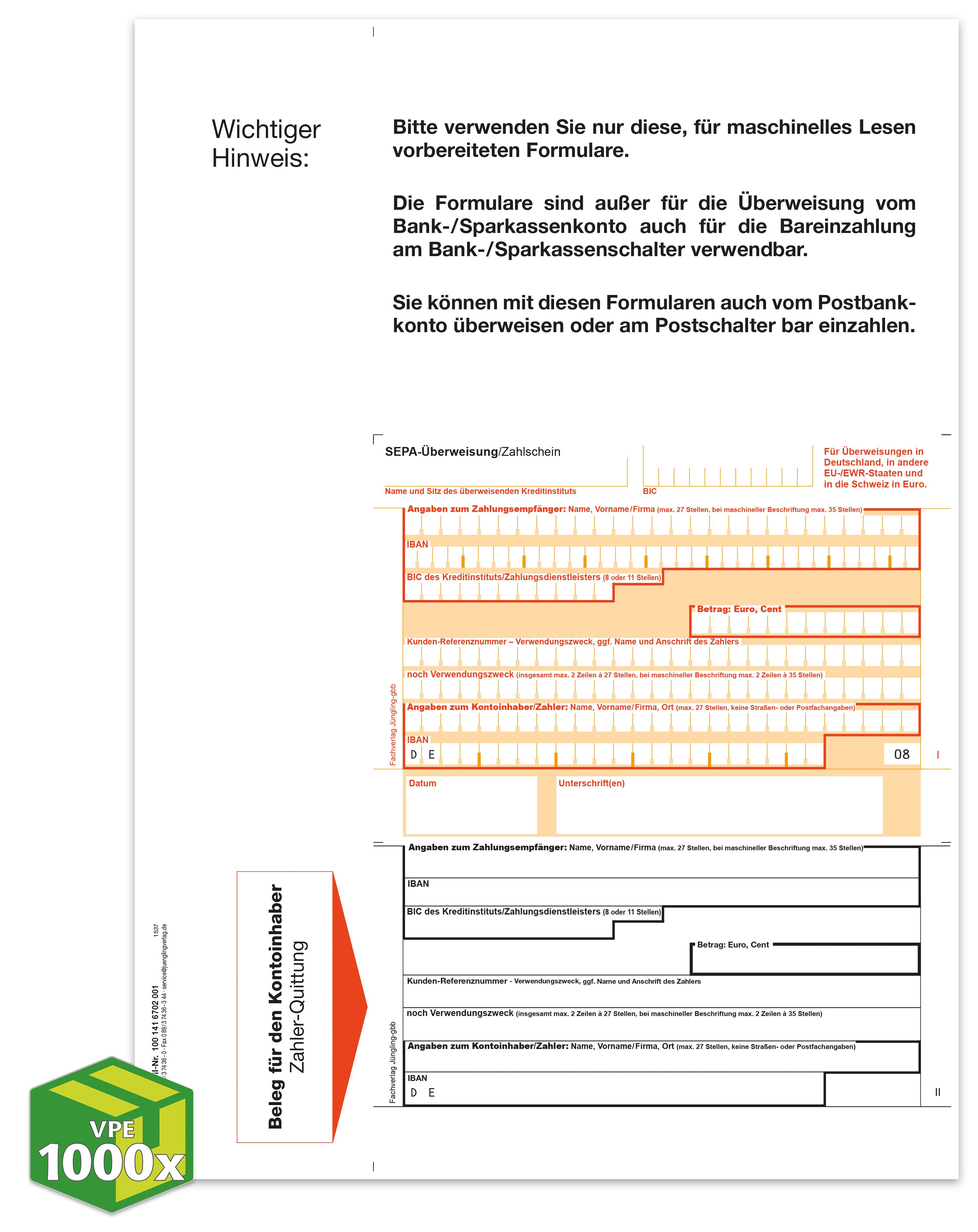 Der SEPA Zahlschein ist im DIN A4 Format und wird aus beleglesefähigem OCR-Spezialpapier hergestellt. Er ist längs- und querperforiert, was ein einfaches Abtrennen des Zahlscheins ermöglicht. Der Zahlschein kann mit individuellem Eindruck versehen werden.
