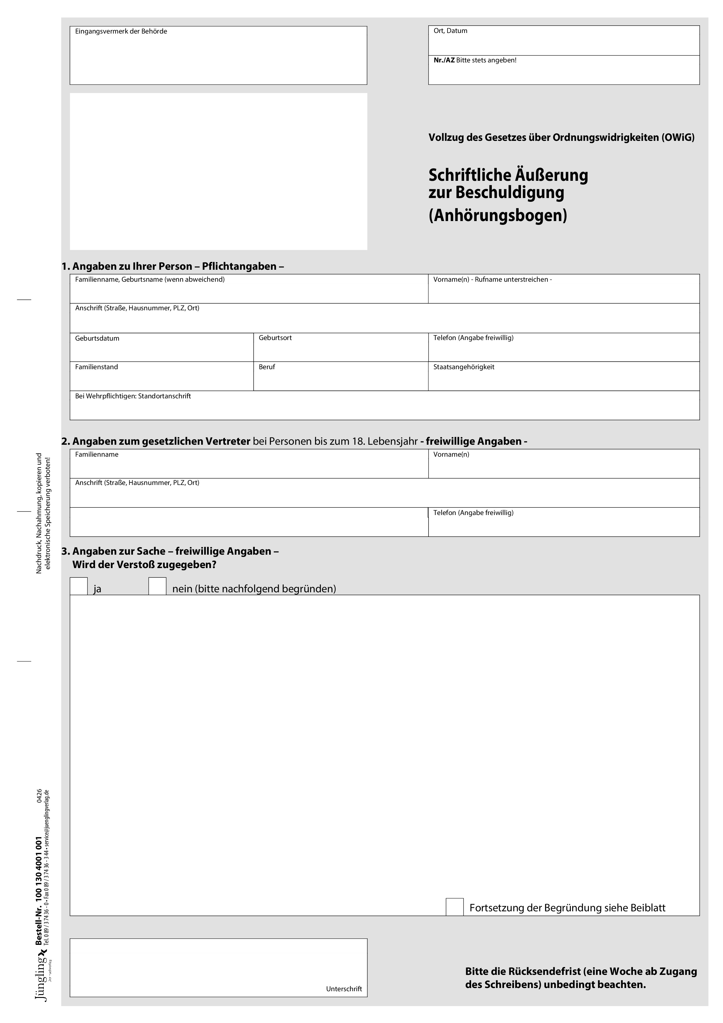 Schriftliche Äußerung zur Beschuldigung (Anhörungsbogen), A4